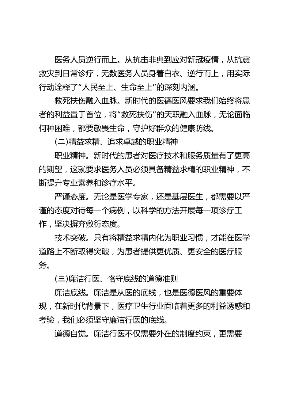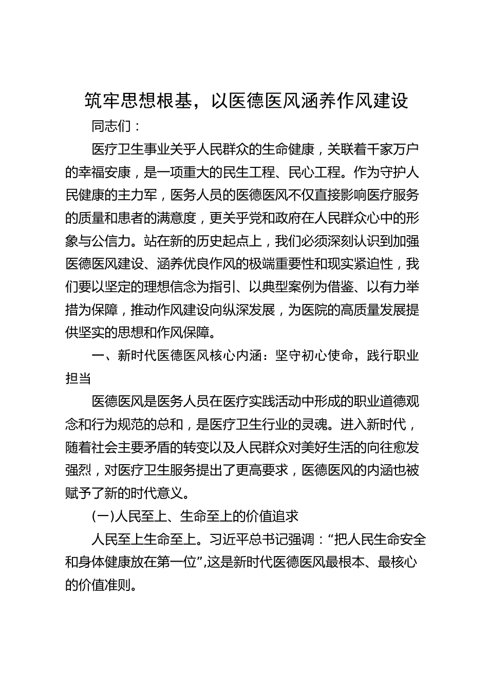 筑牢思想根基,以醫(yī)德醫(yī)風涵養(yǎng)作風建設同志們:醫(yī)療衛(wèi)生事業(yè)關乎人民群眾的生命健康,關聯(lián)著千家萬戶的幸福安康,是一項重大的民生工程、民心工程。作為守護人民健康的主力軍,醫(yī)務人員的醫(yī)德醫(yī)風不僅直接影響醫(yī)療服務的質量和患者的滿意度,更關乎黨和政府在人民群眾心中的形象與公信力。站在新的歷史起點上,我們必須深刻認識到加強醫(yī)德醫(yī)風建設、涵養(yǎng)優(yōu)良作風的極端重要性和現(xiàn)實緊迫性,我們要以堅定的理想信念為指引、以典型案例為借鑒、以有力舉措為保障,推動作風建設向縱深發(fā)展,為醫(yī)院的高質量發(fā)展提供堅實的思想和作風保障。一、新時代醫(yī)德醫(yī)風核心內(nèi)涵:堅守初...