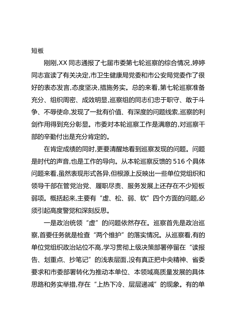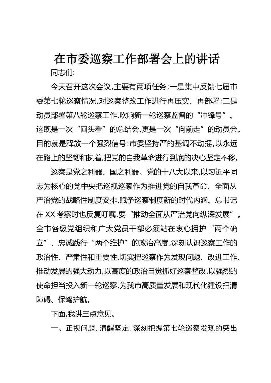 在市委巡察工作部署會上的講話同志們:今天召開這次會議,主要有兩項任務(wù):一是集中反饋七屆市委第七輪巡察情況,對巡察整改工作進(jìn)行再壓實、再部署;二是動員部署第八輪巡察工作,吹響新一輪巡察監(jiān)督的“沖鋒號”。這既是一次“回頭看”的總結(jié)會,更是一次“向前走”的動員會。目的就是釋放一個強烈信號:市委堅持嚴(yán)的基調(diào)不動搖,以永遠(yuǎn)在路上的堅韌和執(zhí)著,把黨的自我革命進(jìn)行到底的決心堅定不移。巡察是黨之利器、國之利器。黨的十八大以來,以習(xí)近平同志為核心的黨中央把巡視巡察作為推進(jìn)黨的自我革命、全面從嚴(yán)治黨的戰(zhàn)略性制度安排,賦予巡察制度新的時代內(nèi)涵??倳浽赬X考察...