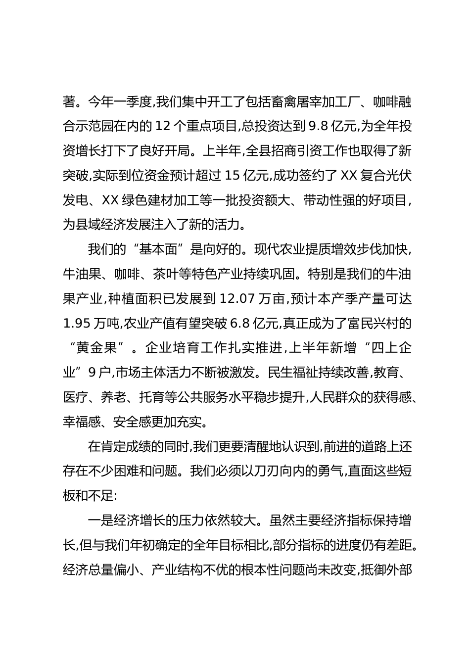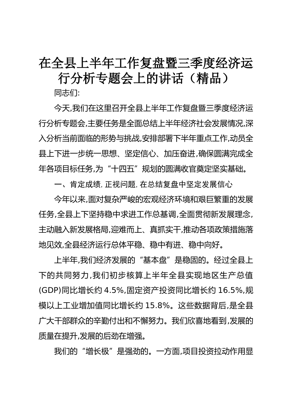 在全縣上半年工作復(fù)盤暨三季度經(jīng)濟(jì)運(yùn)行分析專題會(huì)上的講話(精品)同志們:今天,我們?cè)谶@里召開全縣上半年工作復(fù)盤暨三季度經(jīng)濟(jì)運(yùn)行分析專題會(huì),主要任務(wù)是全面總結(jié)上半年經(jīng)濟(jì)社會(huì)發(fā)展情況,深入分析當(dāng)前面臨的形勢(shì)與挑戰(zhàn),安排部署下半年重點(diǎn)工作,動(dòng)員全縣上下進(jìn)一步統(tǒng)一思想、堅(jiān)定信心、加壓奮進(jìn),確保圓滿完成全年各項(xiàng)目標(biāo)任務(wù),為“十四五”規(guī)劃的圓滿收官奠定堅(jiān)實(shí)基礎(chǔ)。一、肯定成績(jī),正視問題,在總結(jié)復(fù)盤中堅(jiān)定發(fā)展信心今年以來(lái),面對(duì)復(fù)雜嚴(yán)峻的宏觀經(jīng)濟(jì)環(huán)境和艱巨繁重的發(fā)展任務(wù),全縣上下堅(jiān)持穩(wěn)中求進(jìn)工作總基調(diào),全面貫徹新發(fā)展理念,主動(dòng)融入新發(fā)展格局,迎難而上、真抓實(shí)...