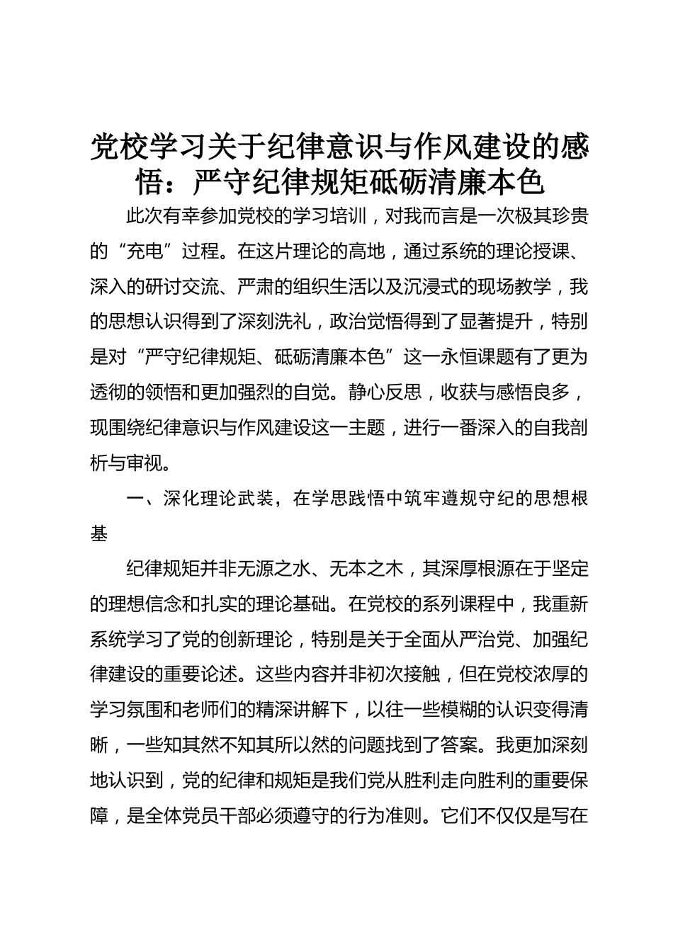 黨校學(xué)習(xí)關(guān)于紀(jì)律意識(shí)與作風(fēng)建設(shè)的感悟:嚴(yán)守紀(jì)律規(guī)矩砥礪清廉本色此次有幸參加黨校的學(xué)習(xí)培訓(xùn),對(duì)我而言是一次極其珍貴的“充電”過(guò)程。在這片理論的高地,通過(guò)系統(tǒng)的理論授課、深入的研討交流、嚴(yán)肅的組織生活以及沉浸式的現(xiàn)場(chǎng)教學(xué),我的思想認(rèn)識(shí)得到了深刻洗禮,政治覺(jué)悟得到了顯著提升,特別是對(duì)“嚴(yán)守紀(jì)律規(guī)矩、砥礪清廉本色”這一永恒課題有了更為透徹的領(lǐng)悟和更加強(qiáng)烈的自覺(jué)。靜心反思,收獲與感悟良多,現(xiàn)圍繞紀(jì)律意識(shí)與作風(fēng)建設(shè)這一主題,進(jìn)行一番深入的自我剖析與審視。一、深化理論武裝,在學(xué)思踐悟中筑牢遵規(guī)守紀(jì)的思想根基紀(jì)律規(guī)矩并非無(wú)源之水、無(wú)本之木,...