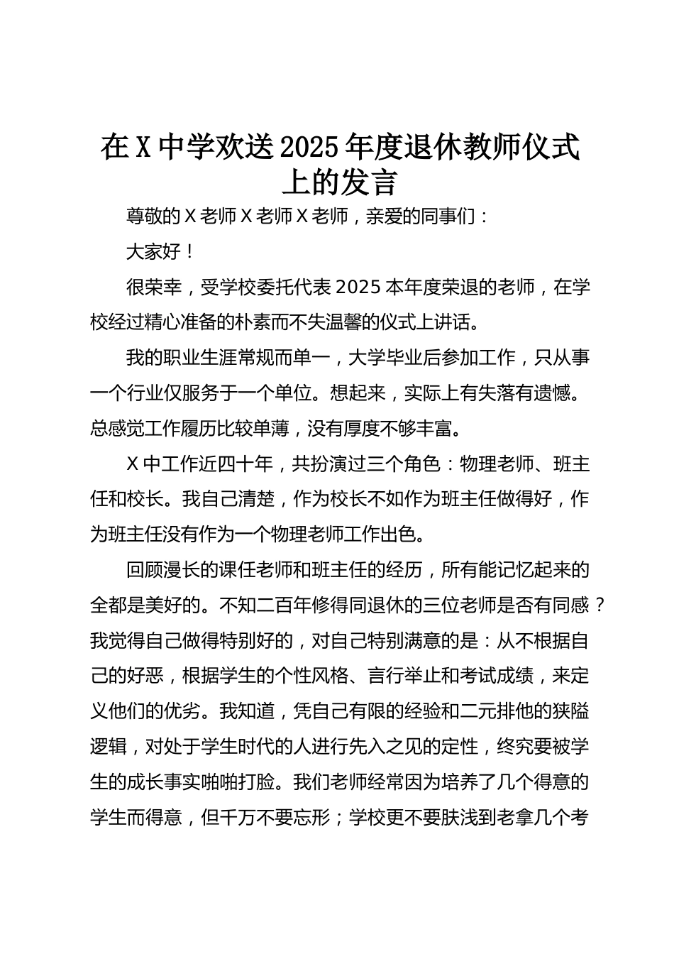 在X中學(xué)歡送2025年度退休教師儀式上的發(fā)言尊敬的X老師X老師X老師,親愛的同事們:大家好!很榮幸,受學(xué)校委托代表2025本年度榮退的老師,在學(xué)校經(jīng)過精心準(zhǔn)備的樸素而不失溫馨的儀式上講話。我的職業(yè)生涯常規(guī)而單一,大學(xué)畢業(yè)后參加工作,只從事一個(gè)行業(yè)僅服務(wù)于一個(gè)單位。想起來,實(shí)際上有失落有遺憾??偢杏X工作履歷比較單薄,沒有厚度不夠豐富。X中工作近四十年,共扮演過三個(gè)角色:物理老師、班主任和校長。我自己清楚,作為校長不如作為班主任做得好,作為班主任沒有作為一個(gè)物理老師工作出色?;仡櫬L的課任老師和班主任的經(jīng)歷,所有能記憶起來的全都是美好的。不...