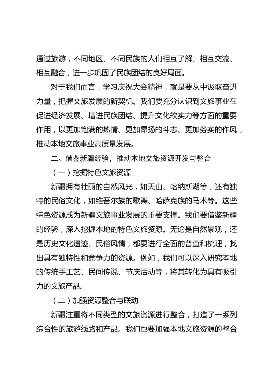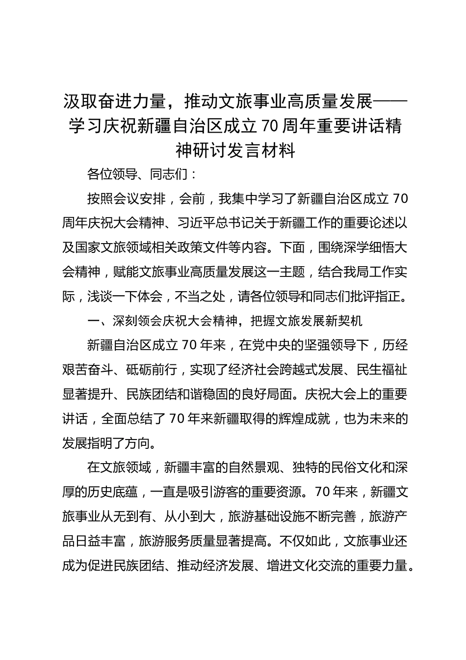 汲取奮進(jìn)力量,推動(dòng)文旅事業(yè)高質(zhì)量發(fā)展——學(xué)習(xí)慶祝新疆自治區(qū)成立70周年重要講話精神研討發(fā)言材料各位領(lǐng)導(dǎo)、同志們:按照會(huì)議安排,會(huì)前,我集中學(xué)習(xí)了新疆自治區(qū)成立70周年慶祝大會(huì)精神、習(xí)近平總書記關(guān)于新疆工作的重要論述以及國家文旅領(lǐng)域相關(guān)政策文件等內(nèi)容。下面,圍繞深學(xué)細(xì)悟大會(huì)精神,賦能文旅事業(yè)高質(zhì)量發(fā)展這一主題,結(jié)合我局工作實(shí)際,淺談一下體會(huì),不當(dāng)之處,請(qǐng)各位領(lǐng)導(dǎo)和同志們批評(píng)指正。一、深刻領(lǐng)會(huì)慶祝大會(huì)精神,把握文旅發(fā)展新契機(jī)新疆自治區(qū)成立70年來,在黨中央的堅(jiān)強(qiáng)領(lǐng)導(dǎo)下,歷經(jīng)艱苦奮斗、砥礪前行,實(shí)現(xiàn)了經(jīng)濟(jì)社會(huì)跨越式發(fā)展、民生福祉顯著提升...