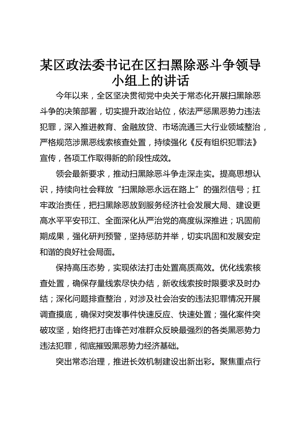 某區(qū)政法委書記在區(qū)掃黑除惡斗爭(zhēng)領(lǐng)導(dǎo)小組上的講話