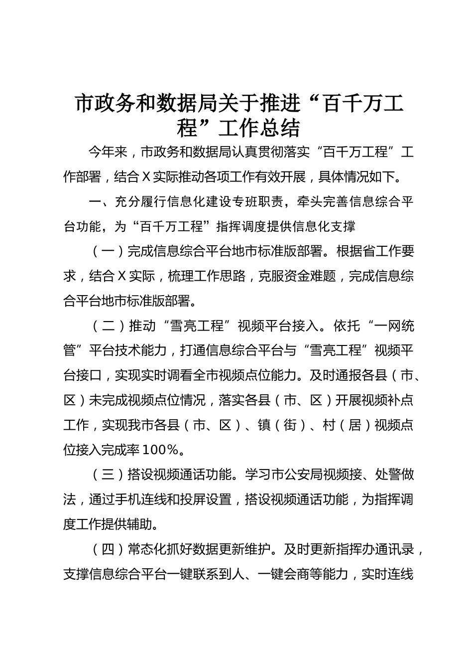 市政務和數(shù)據(jù)局關于推進“百千萬工程”工作總結今年來,市政務和數(shù)據(jù)局認真貫徹落實“百千萬工程”工作部署,結合X實際推動各項工作有效開展,具體情況如下。一、充分履行信息化建設專班職責,牽頭完善信息綜合平臺功能,為“百千萬工程”指揮調度提供信息化支撐(一)完成信息綜合平臺地市標準版部署。根據(jù)省工作要求,結合X實際,梳理工作思路,克服資金難題,完成信息綜合平臺地市標準版部署。(二)推動“雪亮工程”視頻平臺接入。依托“一網(wǎng)統(tǒng)管”平臺技術能力,打通信息綜合平臺與“雪亮工程”視頻平臺接口,實現(xiàn)實時調看全市視頻點位能力。及時通報各縣(市、區(qū))...