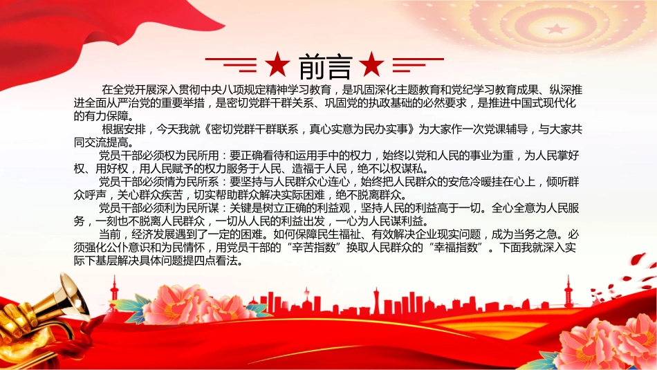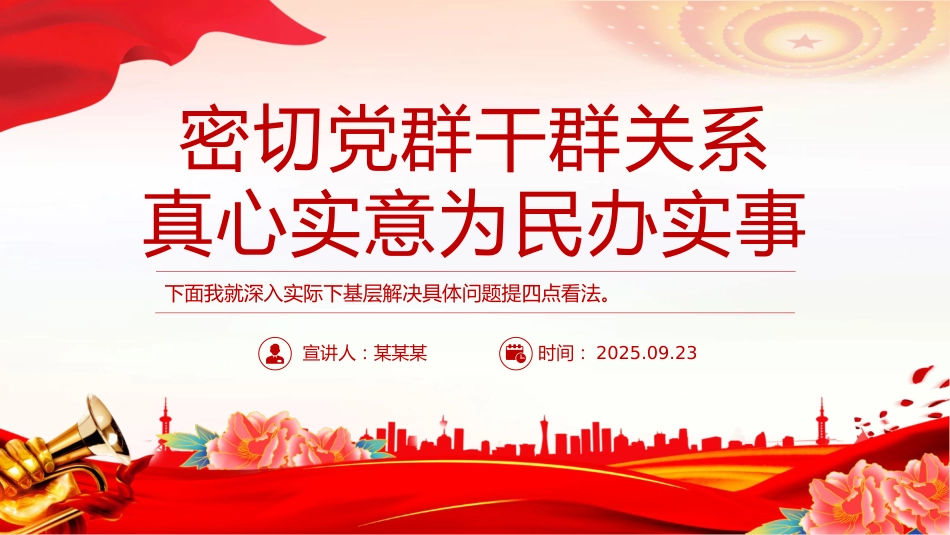 宣講人:某某某時間:2025.09.23密切黨群干群關(guān)系真心實意為民辦實事下面我就深入實際下基層解決具體問題提四點看法。前言在全黨開展深入貫徹中央八項規(guī)定精神學(xué)習(xí)教育,是鞏固深化主題教育和黨紀(jì)學(xué)習(xí)教育成果、縱深推進全面從嚴(yán)治黨的重要舉措,是密切黨群干群關(guān)系、鞏固黨的執(zhí)政基礎(chǔ)的必然要求,是推進中國式現(xiàn)代化的有力保障。根據(jù)安排,今天我就《密切黨群干群聯(lián)系,真心實意為民辦實事》為大家作一次黨課輔導(dǎo),與大家共同交流提高。黨員干部必須權(quán)為民所用:要正確看待和運用手中的權(quán)力,始終以黨和人民的事業(yè)為重,為人民掌好權(quán)、用好權(quán),用人民賦予的權(quán)力服務(wù)于人...