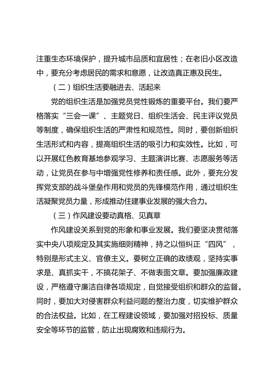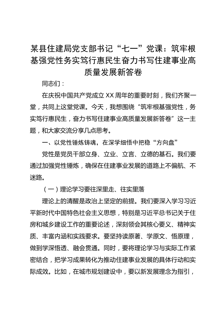 某縣住建局黨支部書記“七一”黨課:筑牢根基強(qiáng)黨性務(wù)實(shí)篤行惠民生奮力書寫住建事業(yè)高質(zhì)量發(fā)展新答卷同志們:在慶祝中國共產(chǎn)黨成立XX周年的重要時(shí)刻,我們齊聚一堂,共同上這堂黨課。今天,我想圍繞“筑牢根基強(qiáng)黨性,務(wù)實(shí)篤行惠民生,奮力書寫住建事業(yè)高質(zhì)量發(fā)展新答卷”這一主題,和大家交流分享幾點(diǎn)思考。一、以黨性錘煉鑄魂,在深學(xué)細(xì)悟中把穩(wěn)“方向盤”黨性是黨員干部立身、立業(yè)、立言、立德的基石。我們要通過加強(qiáng)黨性錘煉,確保在住建事業(yè)發(fā)展的道路上不偏航、不迷路。(一)理論學(xué)習(xí)要往深里走、往實(shí)里落理論上的清醒是政治上堅(jiān)定的前提。我們要深入學(xué)習(xí)習(xí)近平新...