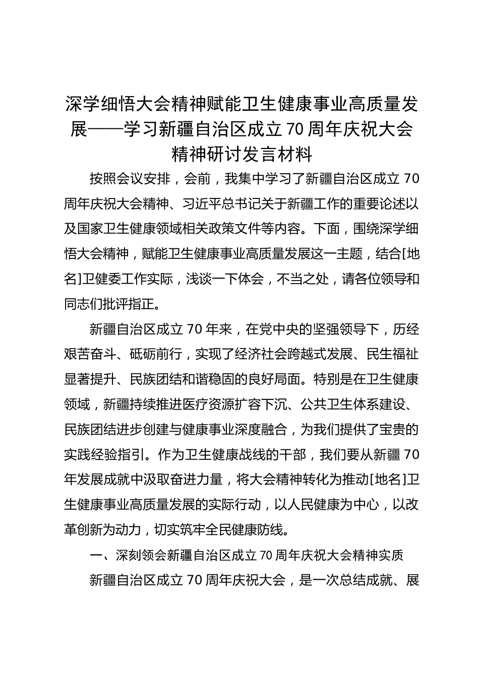深學細悟大會精神賦能衛(wèi)生健康事業(yè)高質(zhì)量發(fā)展——學習新疆自治區(qū)成立70周年慶祝大會精神研討發(fā)言材料按照會議安排,會前,我集中學習了新疆自治區(qū)成立70周年慶祝大會精神、習近平總書記關于新疆工作的重要論述以及國家衛(wèi)生健康領域相關政策文件等內(nèi)容。下面,圍繞深學細悟大會精神,賦能衛(wèi)生健康事業(yè)高質(zhì)量發(fā)展這一主題,結合[地名]衛(wèi)健委工作實際,淺談一下體會,不當之處,請各位領導和同志們批評指正。新疆自治區(qū)成立70年來,在黨中央的堅強領導下,歷經(jīng)艱苦奮斗、砥礪前行,實現(xiàn)了經(jīng)濟社會跨越式發(fā)展、民生福祉顯著提升、民族團結和諧穩(wěn)固的良好局面。特別是在衛(wèi)生健...