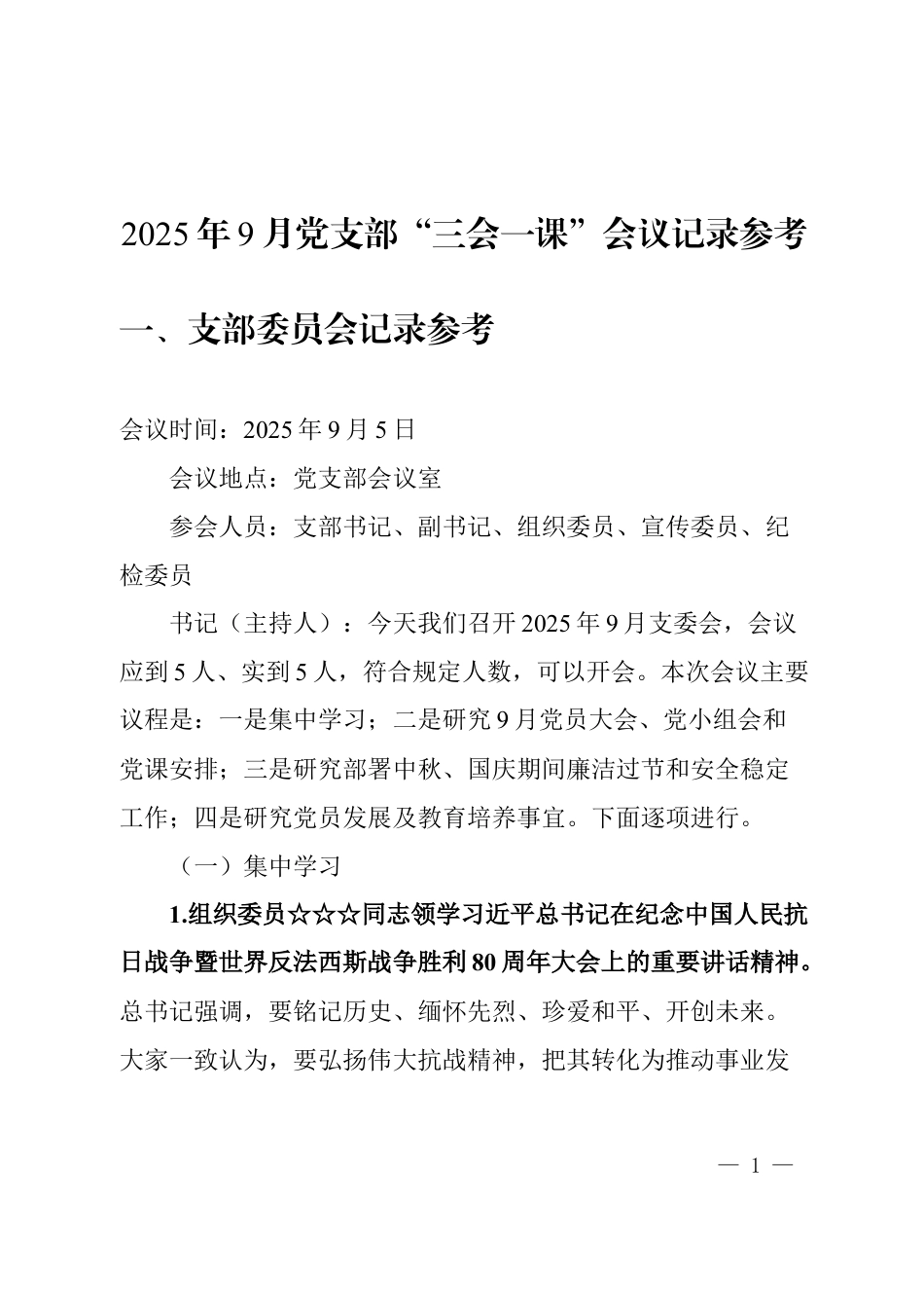 2025年9月黨支部“三會(huì)一課”會(huì)議記錄參考一、支部委員會(huì)記錄參考會(huì)議時(shí)間:2025年9月5日會(huì)議地點(diǎn):黨支部會(huì)議室參會(huì)人員:支部書(shū)記、副書(shū)記、組織委員、宣傳委員、紀(jì)檢委員書(shū)記(主持人):今天我們召開(kāi)2025年9月支委會(huì),會(huì)議應(yīng)到5人、實(shí)到5人,符合規(guī)定人數(shù),可以開(kāi)會(huì)。本次會(huì)議主要議程是:一是集中學(xué)習(xí);二是研究9月黨員大會(huì)、黨小組會(huì)和黨課安排;三是研究部署中秋、國(guó)慶期間廉潔過(guò)節(jié)和安全穩(wěn)定工作;四是研究黨員發(fā)展及教育培養(yǎng)事宜。下面逐項(xiàng)進(jìn)行。(一)集中學(xué)習(xí)1.組織委員☆☆☆同志領(lǐng)學(xué)習(xí)近平總書(shū)記在紀(jì)念中國(guó)人民抗日戰(zhàn)爭(zhēng)暨世界反法西斯戰(zhàn)爭(zhēng)勝利80周年大會(huì)上...