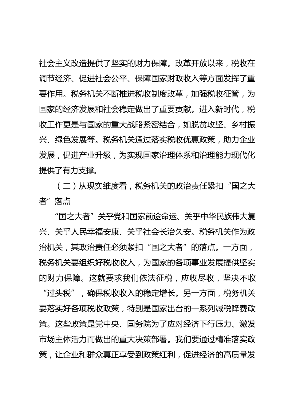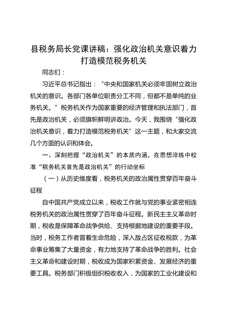 縣稅務(wù)局長黨課講稿:強(qiáng)化政治機(jī)關(guān)意識著力打造模范稅務(wù)機(jī)關(guān)同志們:習(xí)近平總書記指出:“中央和國家機(jī)關(guān)必須牢固樹立政治機(jī)關(guān)的意識。各部門各單位職責(zé)分工不同,但都不是單純的業(yè)務(wù)機(jī)關(guān)?!倍悇?wù)機(jī)關(guān)作為國家重要的經(jīng)濟(jì)管理和執(zhí)法部門,首先是政治機(jī)關(guān),必須旗幟鮮明講政治。今天,我圍繞“強(qiáng)化政治機(jī)關(guān)意識,著力打造模范稅務(wù)機(jī)關(guān)”這一主題,和大家交流幾個(gè)方面的認(rèn)識和體會(huì)。一、深刻把握“政治機(jī)關(guān)”的本質(zhì)內(nèi)涵,在思想淬煉中校準(zhǔn)“稅務(wù)機(jī)關(guān)首先是政治機(jī)關(guān)”的行動(dòng)坐標(biāo)(一)從歷史維度看,稅務(wù)機(jī)關(guān)的政治屬性貫穿百年奮斗征程自中國共產(chǎn)黨成立以來,稅收工作就與黨...