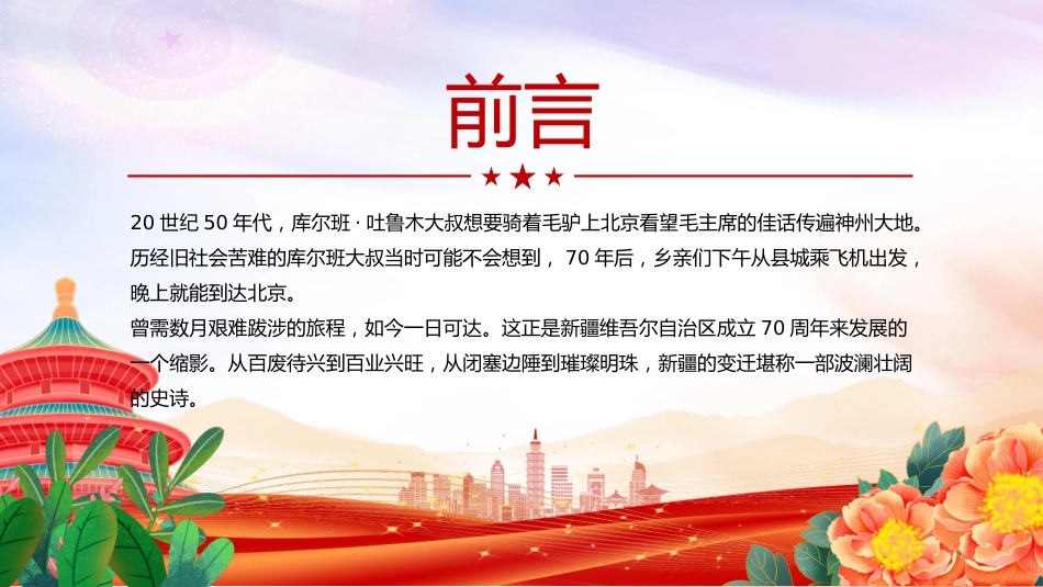 天山煥新顏絲路著華章宣講人:某某某時間:2025.09.28工圖網(wǎng)——新疆維吾爾自治區(qū)成立70周年——前言20世紀(jì)50年代,庫爾班·吐魯木大叔想要騎著毛驢上北京看望毛主席的佳話傳遍神州大地。歷經(jīng)舊社會苦難的庫爾班大叔當(dāng)時可能不會想到,70年后,鄉(xiāng)親們下午從縣城乘飛機(jī)出發(fā),晚上就能到達(dá)北京。曾需數(shù)月艱難跋涉的旅程,如今一日可達(dá)。這正是新疆維吾爾自治區(qū)成立70周年來發(fā)展的一個縮影。從百廢待興到百業(yè)興旺,從閉塞邊陲到璀璨明珠,新疆的變遷堪稱一部波瀾壯闊的史詩。前言黨的十八大以來,新疆各族干部群眾沿著習(xí)近平總書記指引的方向,完整準(zhǔn)確全面貫徹新時代黨的治...