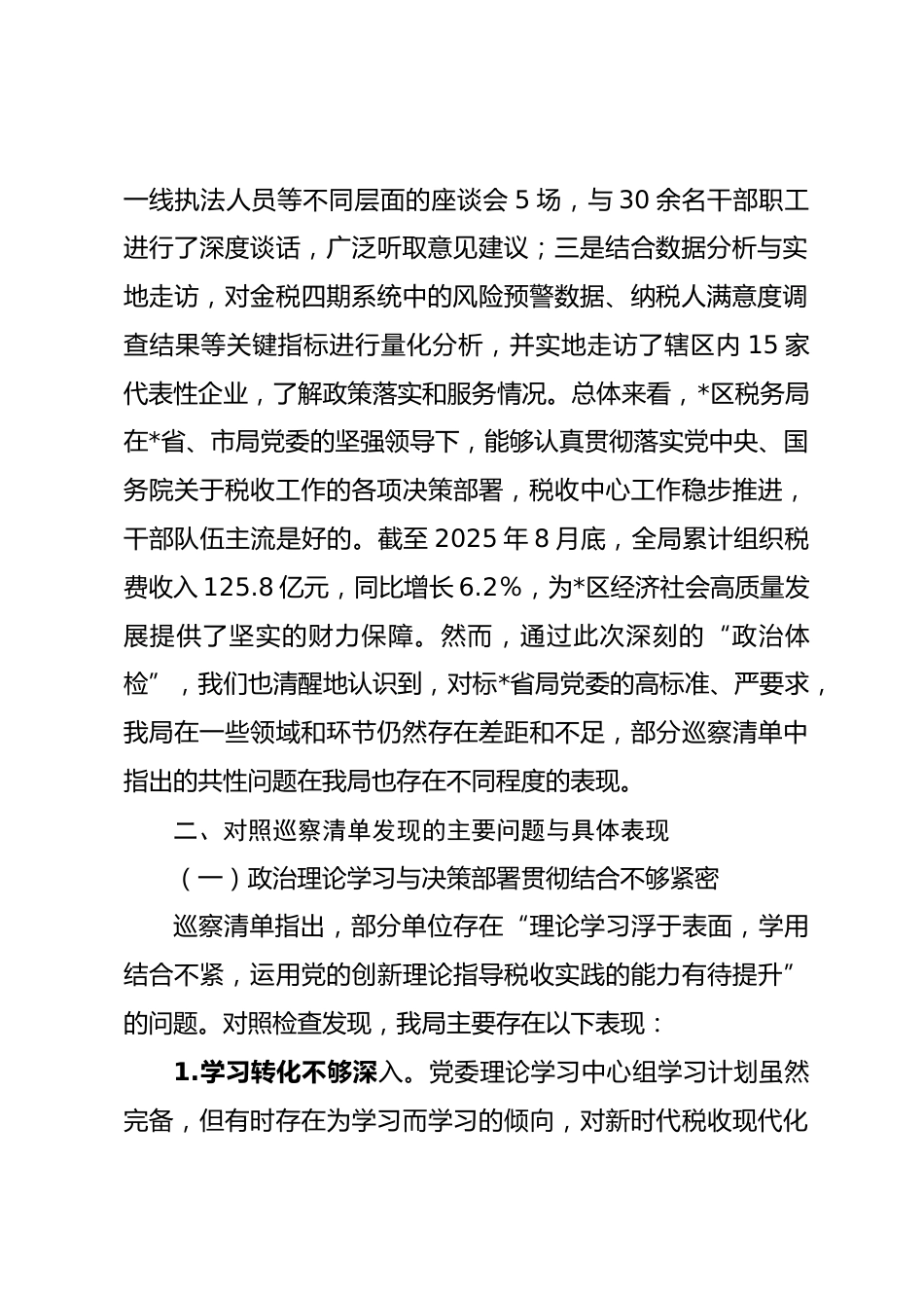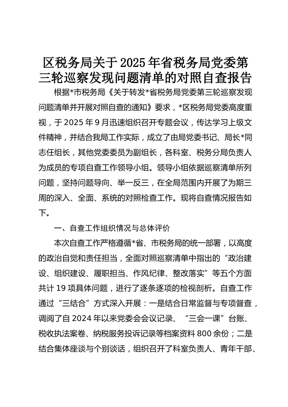 區(qū)稅務(wù)局關(guān)于2025年省稅務(wù)局黨委第三輪巡察發(fā)現(xiàn)問(wèn)題清單的對(duì)照自查報(bào)告根據(jù)*市稅務(wù)局《關(guān)于轉(zhuǎn)發(fā)*省稅務(wù)局黨委第三輪巡察發(fā)現(xiàn)問(wèn)題清單并開(kāi)展對(duì)照自查的通知》要求,*區(qū)稅務(wù)局黨委高度重視,于2025年9月迅速組織召開(kāi)專(zhuān)題會(huì)議,傳達(dá)學(xué)習(xí)上級(jí)文件精神,并結(jié)合我局工作實(shí)際,成立了由局黨委書(shū)記、局長(zhǎng)*同志任組長(zhǎng),其他黨委委員為副組長(zhǎng),各科室、稅務(wù)分局負(fù)責(zé)人為成員的專(zhuān)項(xiàng)自查工作領(lǐng)導(dǎo)小組。領(lǐng)導(dǎo)小組依據(jù)巡察清單所列問(wèn)題,堅(jiān)持問(wèn)題導(dǎo)向、舉一反三,在全局范圍內(nèi)開(kāi)展了為期三周的深入、全面、系統(tǒng)的對(duì)照檢查工作?,F(xiàn)將自查情況報(bào)告如下。一、自查工作組織情況與總體評(píng)價(jià)本...