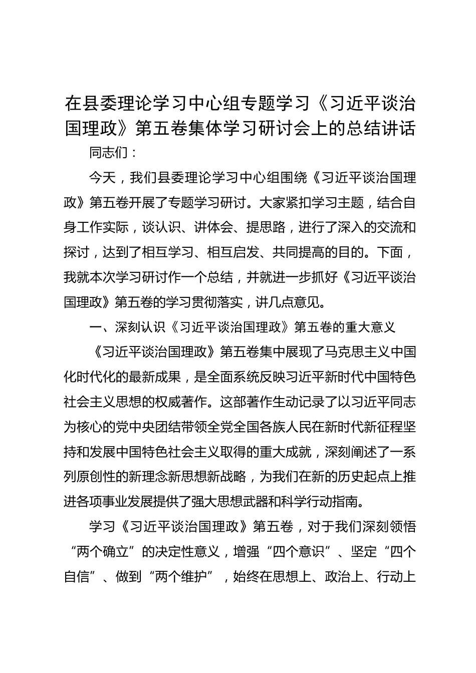 在縣委理論學(xué)習(xí)中心組專題學(xué)習(xí)《習(xí)近平談治國(guó)理政》第五卷集體學(xué)習(xí)研討會(huì)上的總結(jié)講話同志們:今天,我們縣委理論學(xué)習(xí)中心組圍繞《習(xí)近平談治國(guó)理政》第五卷開展了專題學(xué)習(xí)研討。大家緊扣學(xué)習(xí)主題,結(jié)合自身工作實(shí)際,談?wù)J識(shí)、講體會(huì)、提思路,進(jìn)行了深入的交流和探討,達(dá)到了相互學(xué)習(xí)、相互啟發(fā)、共同提高的目的。下面,我就本次學(xué)習(xí)研討作一個(gè)總結(jié),并就進(jìn)一步抓好《習(xí)近平談治國(guó)理政》第五卷的學(xué)習(xí)貫徹落實(shí),講幾點(diǎn)意見。一、深刻認(rèn)識(shí)《習(xí)近平談治國(guó)理政》第五卷的重大意義《習(xí)近平談治國(guó)理政》第五卷集中展現(xiàn)了馬克思主義中國(guó)化時(shí)代化的最新成果,是全面系統(tǒng)反映習(xí)近...