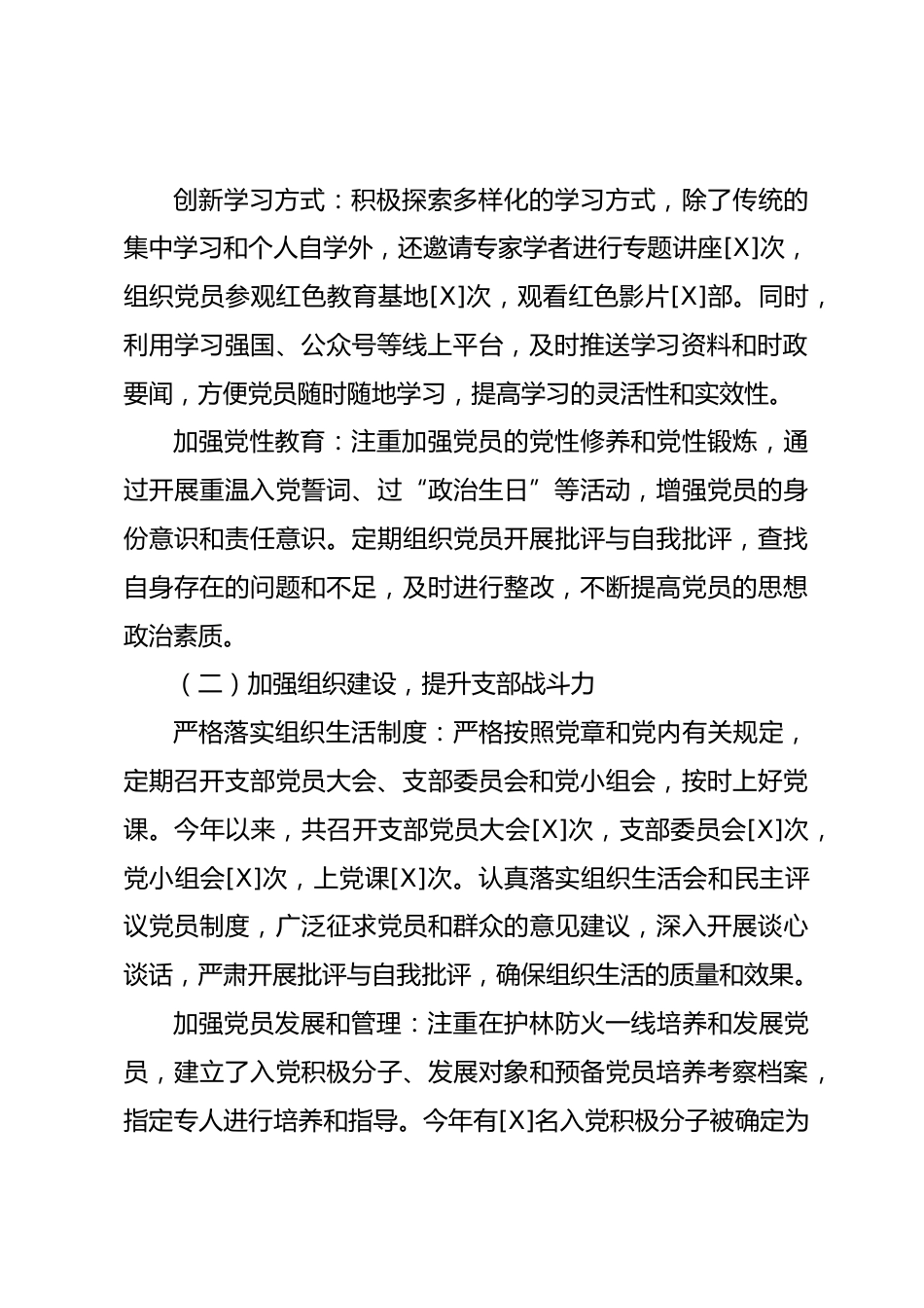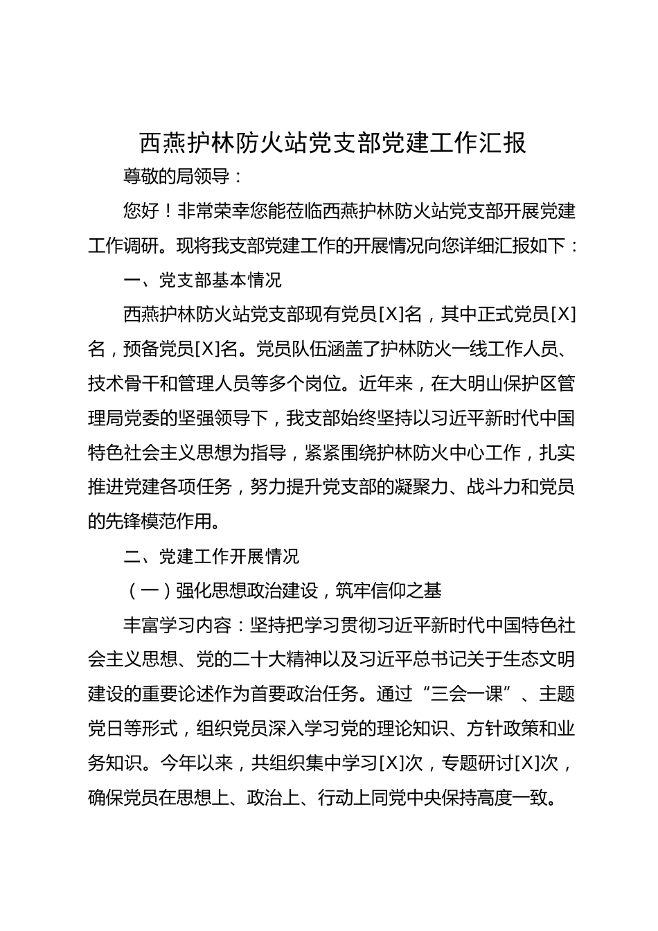 西燕護林防火站黨支部黨建工作匯報尊敬的局領導:您好!非常榮幸您能蒞臨西燕護林防火站黨支部開展黨建工作調(diào)研。現(xiàn)將我支部黨建工作的開展情況向您詳細匯報如下:一、黨支部基本情況西燕護林防火站黨支部現(xiàn)有黨員[X]名,其中正式黨員[X]名,預備黨員[X]名。黨員隊伍涵蓋了護林防火一線工作人員、技術骨干和管理人員等多個崗位。近年來,在大明山保護區(qū)管理局黨委的堅強領導下,我支部始終堅持以習近平新時代中國特色社會主義思想為指導,緊緊圍繞護林防火中心工作,扎實推進黨建各項任務,努力提升黨支部的凝聚力、戰(zhàn)斗力和黨員的先鋒模范作用。二、黨建工作開展情況(...