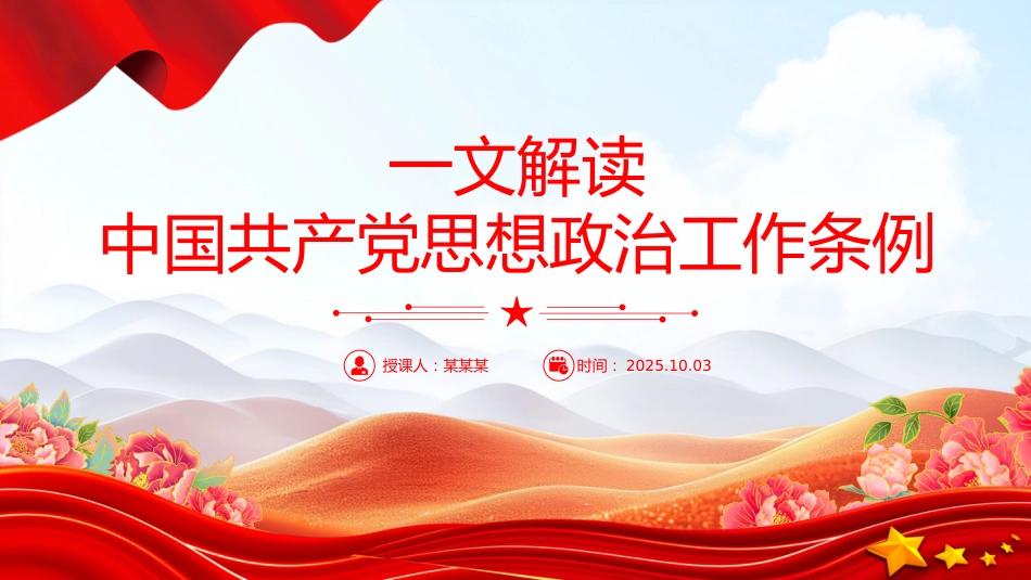 一文解讀中國共產(chǎn)黨思想政治工作條例授課人:某某某時間:2025.10.03前言近日,中共中央印發(fā)了《中國共產(chǎn)黨思想政治工作條例》(以下簡稱《條例》)。中央宣傳部負責人就《條例》有關(guān)情況,回答了記者的提問。問:請介紹一下制定《條例》的背景和意義解讀中國共產(chǎn)黨思想政治工作條例?黨的十八大以來,以習近平同志為核心的黨中央高度重視思想政治工作,習近平總書記發(fā)表一系列重要講話,作出一系列重要指示批示,創(chuàng)造性提出一系列新思想新觀點新論斷,深刻回答了思想政治工作方向性、根本性、全局性問題,推動思想政治工作展現(xiàn)出新氣象新作為,思想政治工作在黨和國家工...