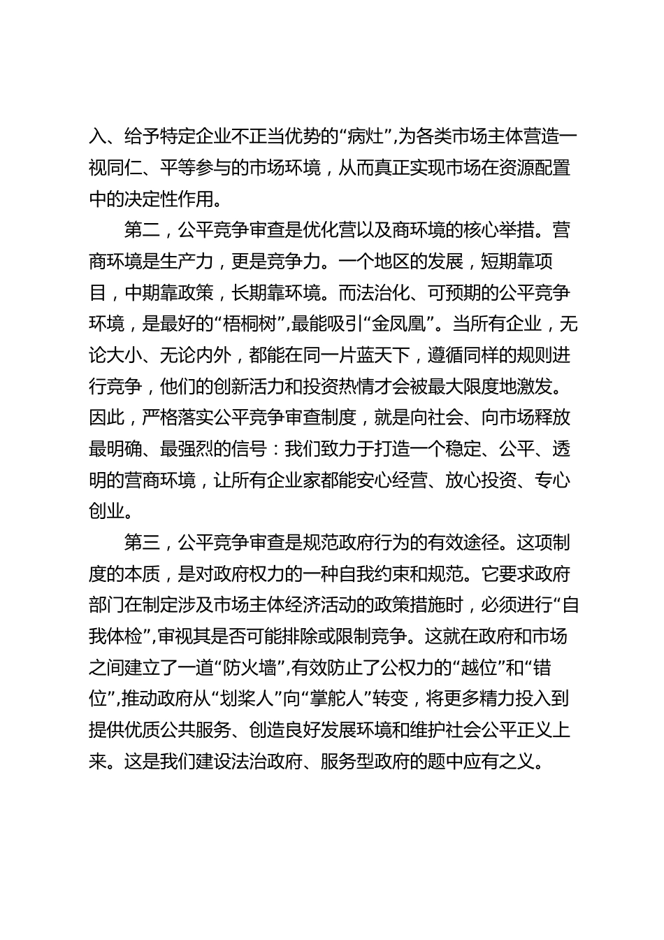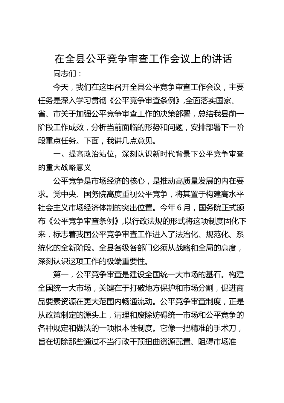 在全縣公平競(jìng)爭(zhēng)審查工作會(huì)議上的講話同志們:今天,我們?cè)谶@里召開(kāi)全縣公平競(jìng)爭(zhēng)審查工作會(huì)議,主要任務(wù)是深入學(xué)習(xí)貫徹《公平競(jìng)爭(zhēng)審查條例》,全面落實(shí)國(guó)家、省、市關(guān)于加強(qiáng)公平競(jìng)爭(zhēng)審查工作的決策部署,總結(jié)我縣前一階段工作成效,分析當(dāng)前面臨的形勢(shì)和問(wèn)題,安排部署下一階段重點(diǎn)任務(wù)。下面,我講幾點(diǎn)意見(jiàn)。一、提高政治站位,深刻認(rèn)識(shí)新時(shí)代背景下公平競(jìng)爭(zhēng)審查的重大戰(zhàn)略意義公平競(jìng)爭(zhēng)是市場(chǎng)經(jīng)濟(jì)的核心,是推動(dòng)高質(zhì)量發(fā)展的內(nèi)在要求。黨中央、國(guó)務(wù)院高度重視公平競(jìng)爭(zhēng),將其置于構(gòu)建高水平社會(huì)主義市場(chǎng)經(jīng)濟(jì)體制的突出位置。今年6月,國(guó)務(wù)院正式頒布《公平競(jìng)爭(zhēng)審查條例》,...