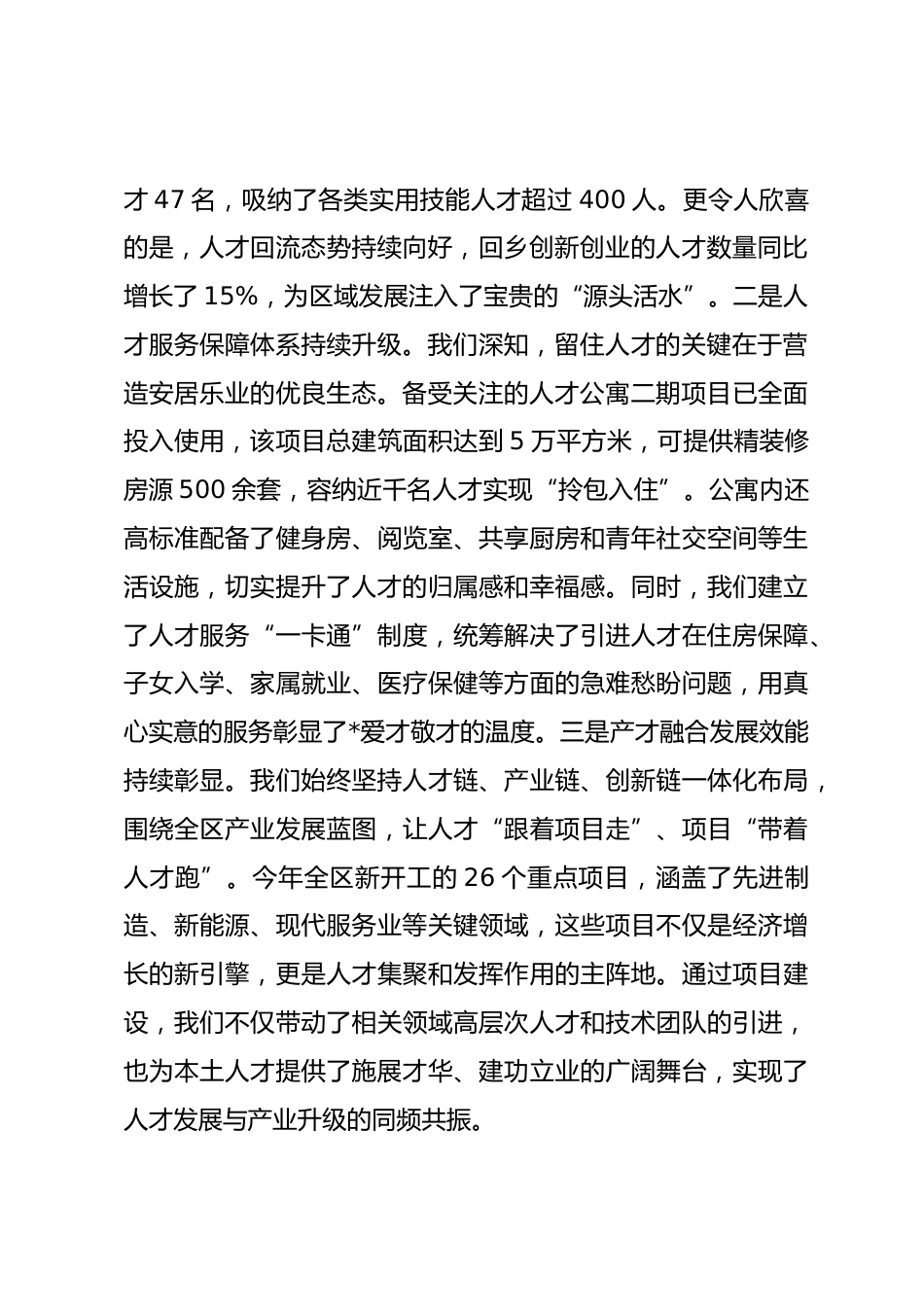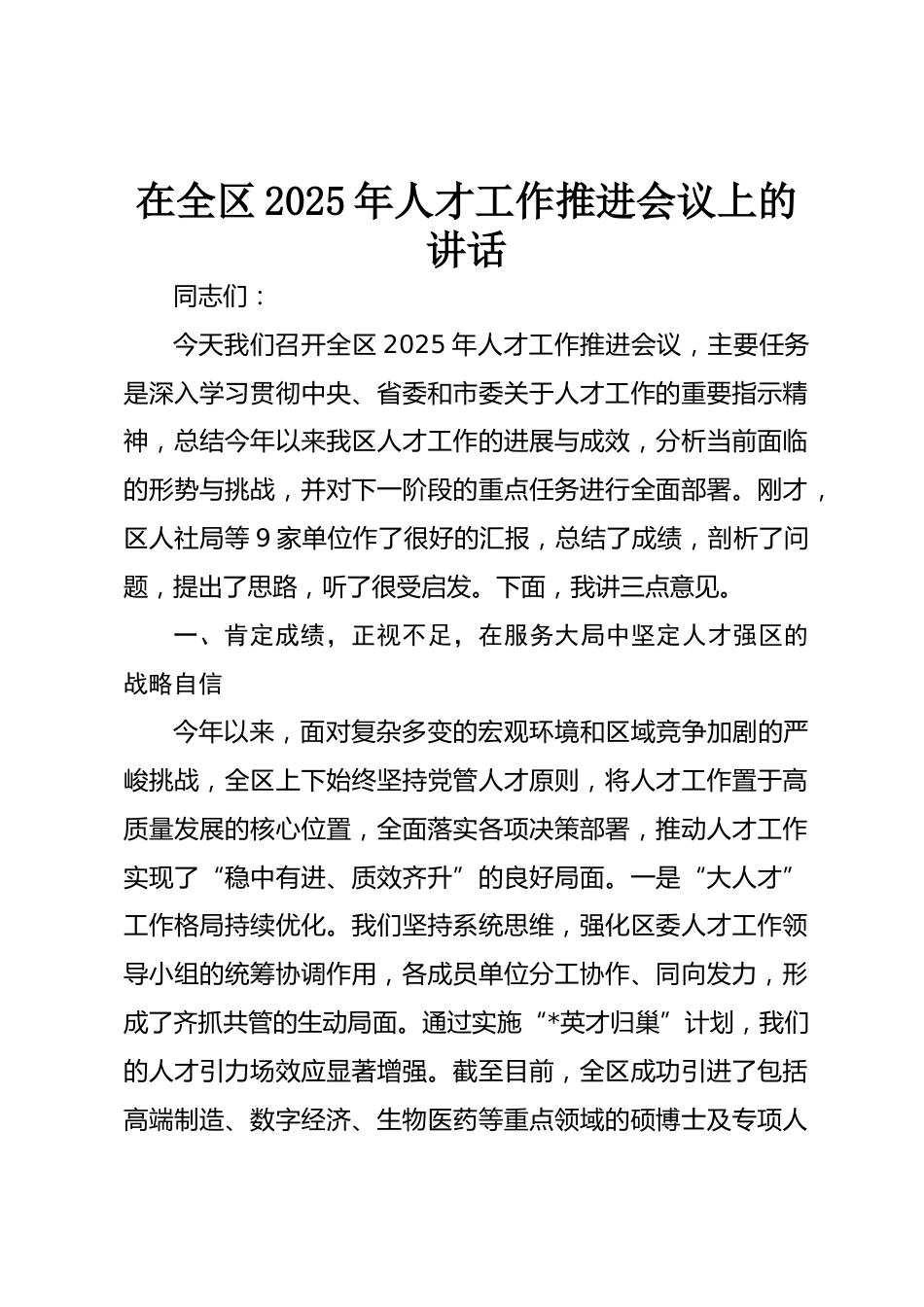 在全區(qū)2025年人才工作推進(jìn)會(huì)議上的講話同志們:今天我們召開(kāi)全區(qū)2025年人才工作推進(jìn)會(huì)議,主要任務(wù)是深入學(xué)習(xí)貫徹中央、省委和市委關(guān)于人才工作的重要指示精神,總結(jié)今年以來(lái)我區(qū)人才工作的進(jìn)展與成效,分析當(dāng)前面臨的形勢(shì)與挑戰(zhàn),并對(duì)下一階段的重點(diǎn)任務(wù)進(jìn)行全面部署。剛才,區(qū)人社局等9家單位作了很好的匯報(bào),總結(jié)了成績(jī),剖析了問(wèn)題,提出了思路,聽(tīng)了很受啟發(fā)。下面,我講三點(diǎn)意見(jiàn)。一、肯定成績(jī),正視不足,在服務(wù)大局中堅(jiān)定人才強(qiáng)區(qū)的戰(zhàn)略自信今年以來(lái),面對(duì)復(fù)雜多變的宏觀環(huán)境和區(qū)域競(jìng)爭(zhēng)加劇的嚴(yán)峻挑戰(zhàn),全區(qū)上下始終堅(jiān)持黨管人才原則,將人才工作置于高質(zhì)量發(fā)展...