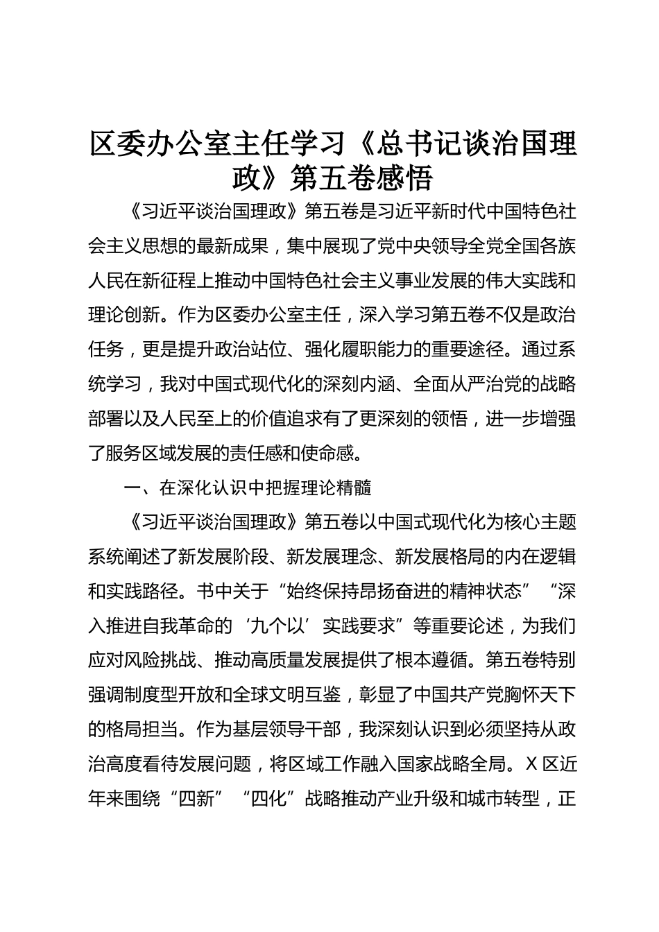 區(qū)委辦公室主任學(xué)習(xí)《總書記談治國理政》第五卷感悟《習(xí)近平談治國理政》第五卷是習(xí)近平新時(shí)代中國特色社會(huì)主義思想的最新成果,集中展現(xiàn)了黨中央領(lǐng)導(dǎo)全黨全國各族人民在新征程上推動(dòng)中國特色社會(huì)主義事業(yè)發(fā)展的偉大實(shí)踐和理論創(chuàng)新。作為區(qū)委辦公室主任,深入學(xué)習(xí)第五卷不僅是政治任務(wù),更是提升政治站位、強(qiáng)化履職能力的重要途徑。通過系統(tǒng)學(xué)習(xí),我對(duì)中國式現(xiàn)代化的深刻內(nèi)涵、全面從嚴(yán)治黨的戰(zhàn)略部署以及人民至上的價(jià)值追求有了更深刻的領(lǐng)悟,進(jìn)一步增強(qiáng)了服務(wù)區(qū)域發(fā)展的責(zé)任感和使命感。一、在深化認(rèn)識(shí)中把握理論精髓《習(xí)近平談治國理政》第五卷以中國式現(xiàn)代化為核心主...