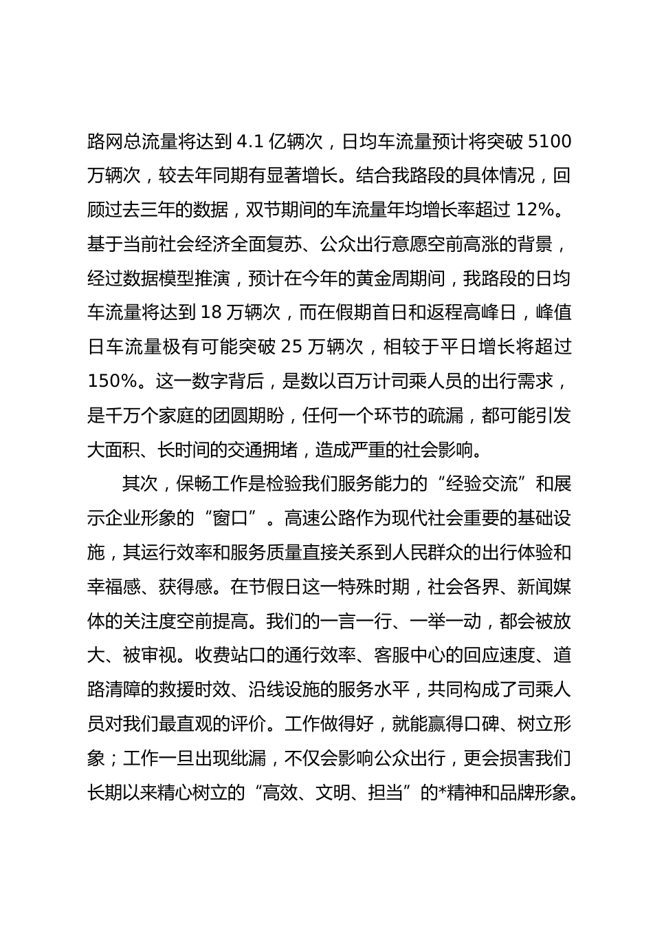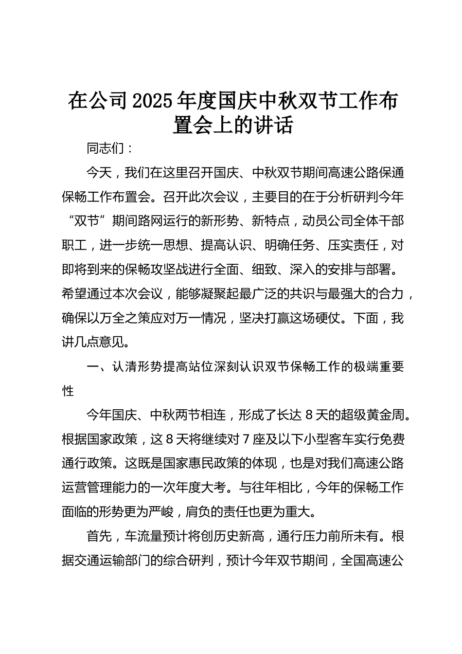 在公司2025年度國(guó)慶中秋雙節(jié)工作布置會(huì)上的講話同志們:今天,我們?cè)谶@里召開(kāi)國(guó)慶、中秋雙節(jié)期間高速公路保通保暢工作布置會(huì)。召開(kāi)此次會(huì)議,主要目的在于分析研判今年“雙節(jié)”期間路網(wǎng)運(yùn)行的新形勢(shì)、新特點(diǎn),動(dòng)員公司全體干部職工,進(jìn)一步統(tǒng)一思想、提高認(rèn)識(shí)、明確任務(wù)、壓實(shí)責(zé)任,對(duì)即將到來(lái)的保暢攻堅(jiān)戰(zhàn)進(jìn)行全面、細(xì)致、深入的安排與部署。希望通過(guò)本次會(huì)議,能夠凝聚起最廣泛的共識(shí)與最強(qiáng)大的合力,確保以萬(wàn)全之策應(yīng)對(duì)萬(wàn)一情況,堅(jiān)決打贏這場(chǎng)硬仗。下面,我講幾點(diǎn)意見(jiàn)。一、認(rèn)清形勢(shì)提高站位深刻認(rèn)識(shí)雙節(jié)保暢工作的極端重要性今年國(guó)慶、中秋兩節(jié)相連,形成了長(zhǎng)達(dá)8天...