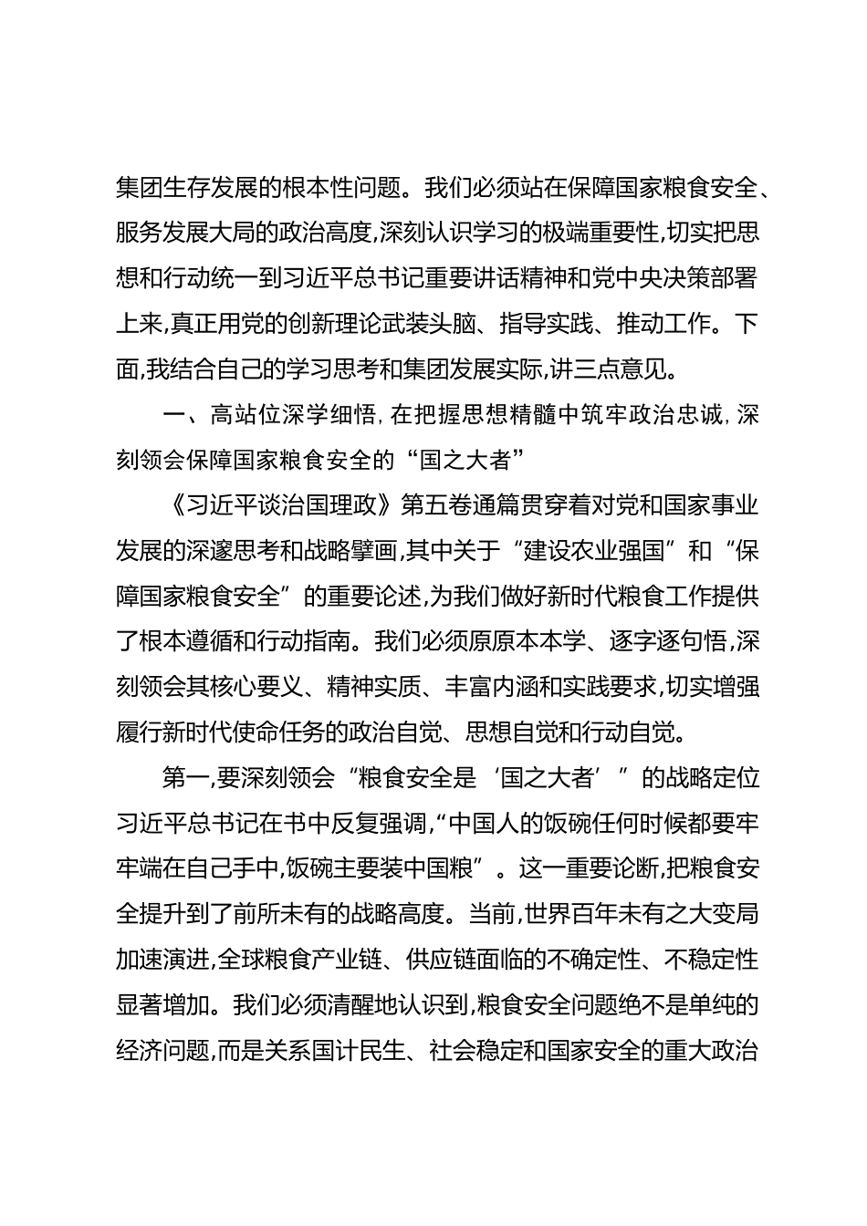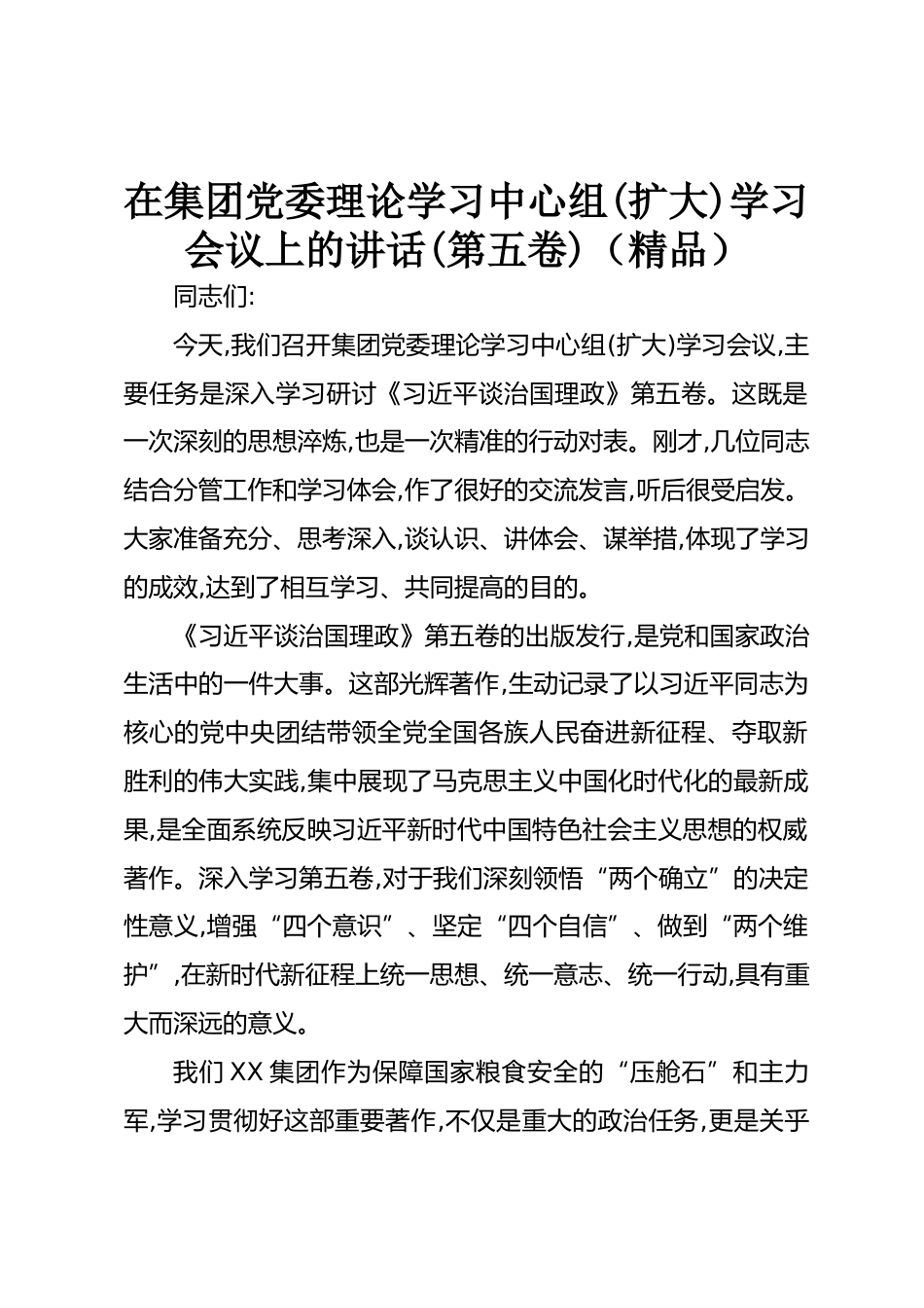 在集團黨委理論學(xué)習(xí)中心組(擴大)學(xué)習(xí)會議上的講話(第五卷)(精品)同志們:今天,我們召開集團黨委理論學(xué)習(xí)中心組(擴大)學(xué)習(xí)會議,主要任務(wù)是深入學(xué)習(xí)研討《習(xí)近平談治國理政》第五卷。這既是一次深刻的思想淬煉,也是一次精準(zhǔn)的行動對表。剛才,幾位同志結(jié)合分管工作和學(xué)習(xí)體會,作了很好的交流發(fā)言,聽后很受啟發(fā)。大家準(zhǔn)備充分、思考深入,談?wù)J識、講體會、謀舉措,體現(xiàn)了學(xué)習(xí)的成效,達到了相互學(xué)習(xí)、共同提高的目的。《習(xí)近平談治國理政》第五卷的出版發(fā)行,是黨和國家政治生活中的一件大事。這部光輝著作,生動記錄了以習(xí)近平同志為核心的黨中央團結(jié)帶領(lǐng)全黨全國各族人民奮進新...