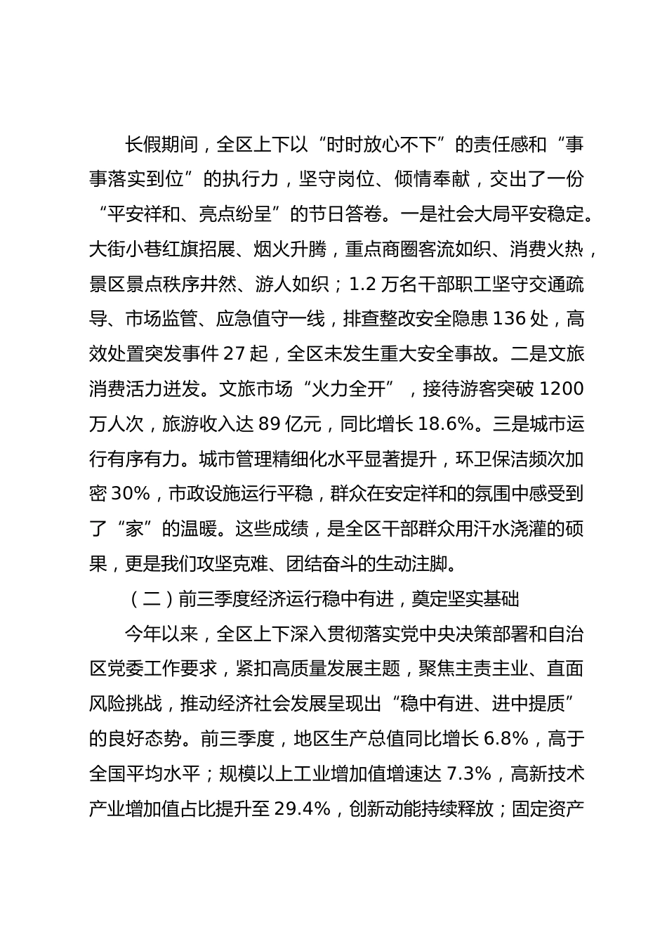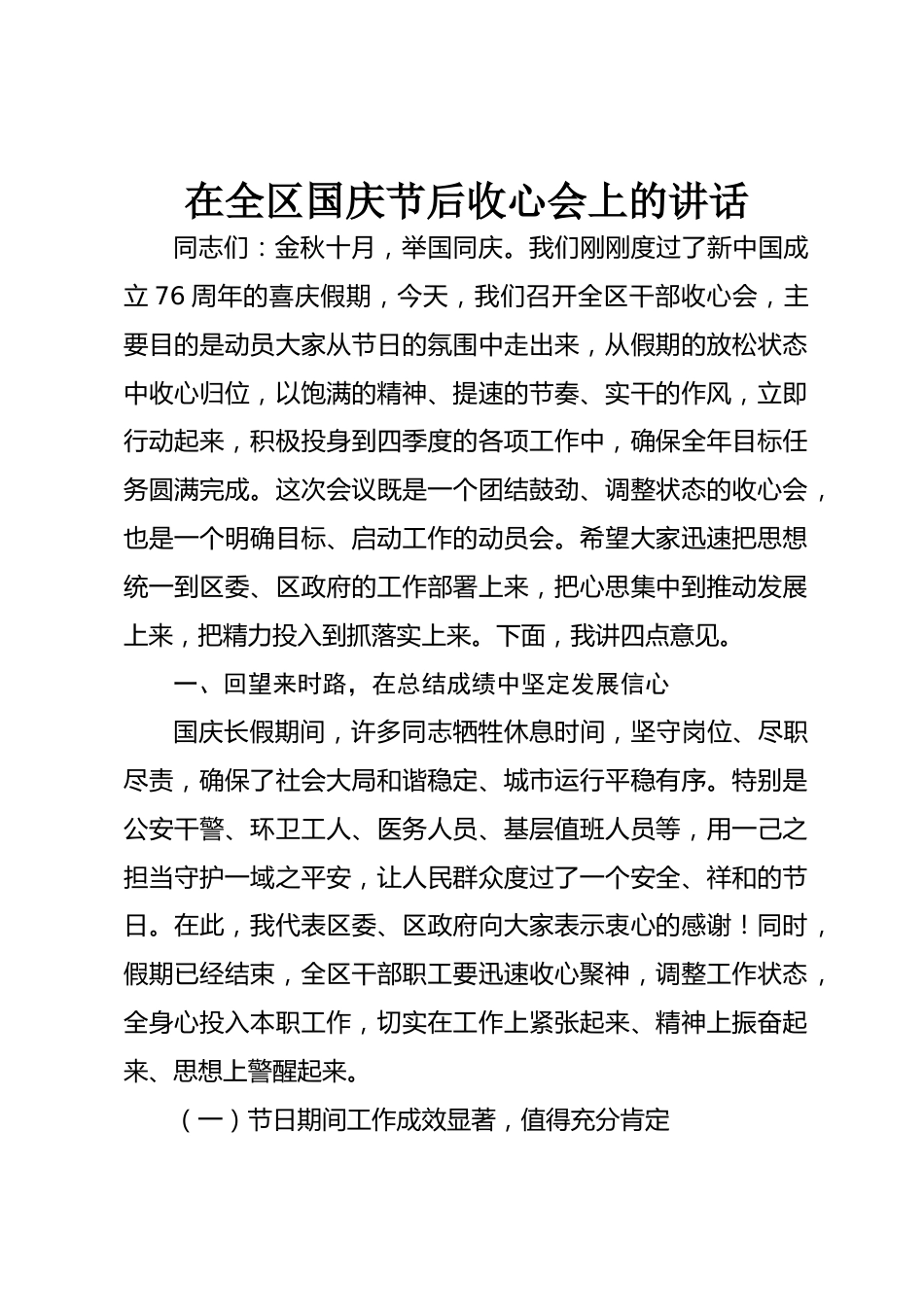 在全區(qū)國慶節(jié)后收心會上的講話同志們:金秋十月,舉國同慶。我們剛剛度過了新中國成立76周年的喜慶假期,今天,我們召開全區(qū)干部收心會,主要目的是動員大家從節(jié)日的氛圍中走出來,從假期的放松狀態(tài)中收心歸位,以飽滿的精神、提速的節(jié)奏、實干的作風(fēng),立即行動起來,積極投身到四季度的各項工作中,確保全年目標(biāo)任務(wù)圓滿完成。這次會議既是一個團(tuán)結(jié)鼓勁、調(diào)整狀態(tài)的收心會,也是一個明確目標(biāo)、啟動工作的動員會。希望大家迅速把思想統(tǒng)一到區(qū)委、區(qū)政府的工作部署上來,把心思集中到推動發(fā)展上來,把精力投入到抓落實上來。下面,我講四點(diǎn)意見。一、回望來時路,在總結(jié)成...