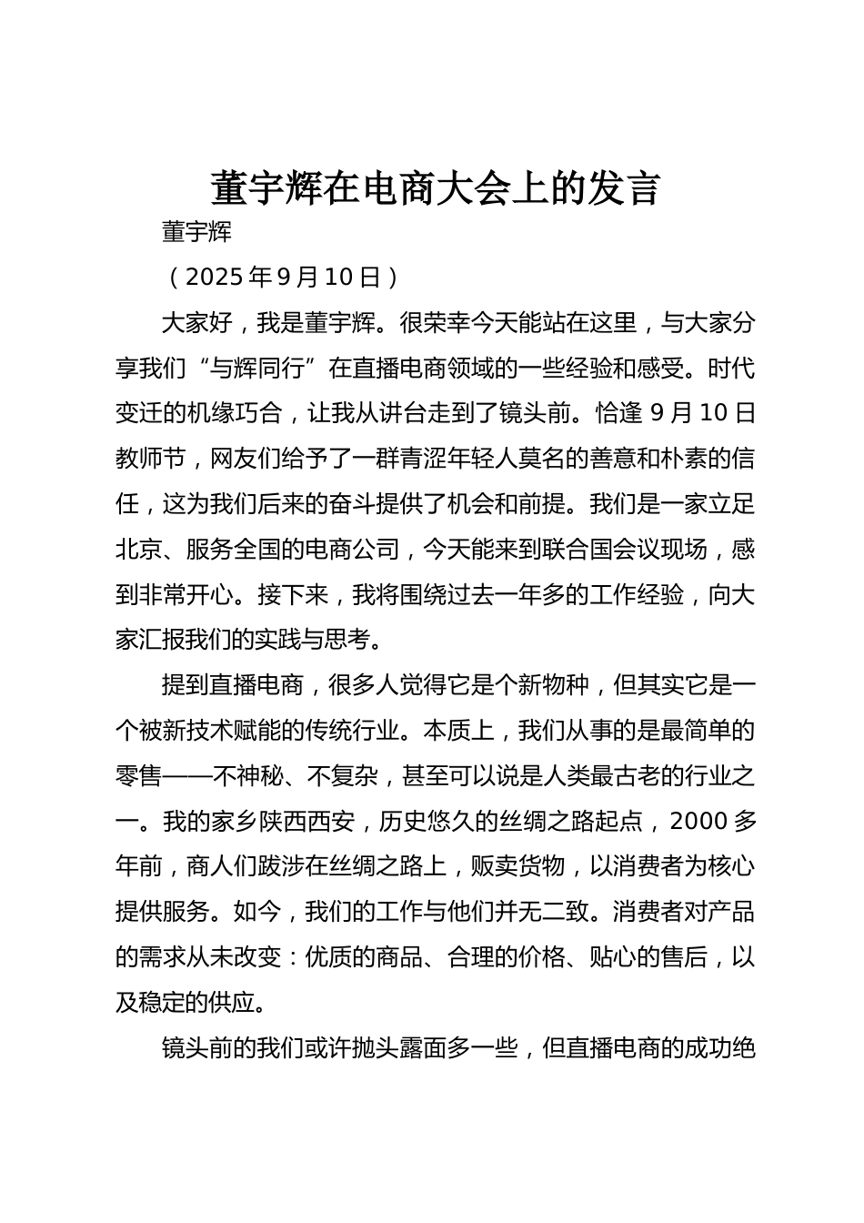 董宇輝在電商大會上的發(fā)言董宇輝(2025年9月10日)大家好,我是董宇輝。很榮幸今天能站在這里,與大家分享我們“與輝同行”在直播電商領(lǐng)域的一些經(jīng)驗(yàn)和感受。時(shí)代變遷的機(jī)緣巧合,讓我從講臺走到了鏡頭前。恰逢9月10日教師節(jié),網(wǎng)友們給予了一群青澀年輕人莫名的善意和樸素的信任,這為我們后來的奮斗提供了機(jī)會和前提。我們是一家立足北京、服務(wù)全國的電商公司,今天能來到聯(lián)合國會議現(xiàn)場,感到非常開心。接下來,我將圍繞過去一年多的工作經(jīng)驗(yàn),向大家匯報(bào)我們的實(shí)踐與思考。提到直播電商,很多人覺得它是個(gè)新物種,但其實(shí)它是一個(gè)被新技術(shù)賦能的傳統(tǒng)行業(yè)。本質(zhì)上,我們...