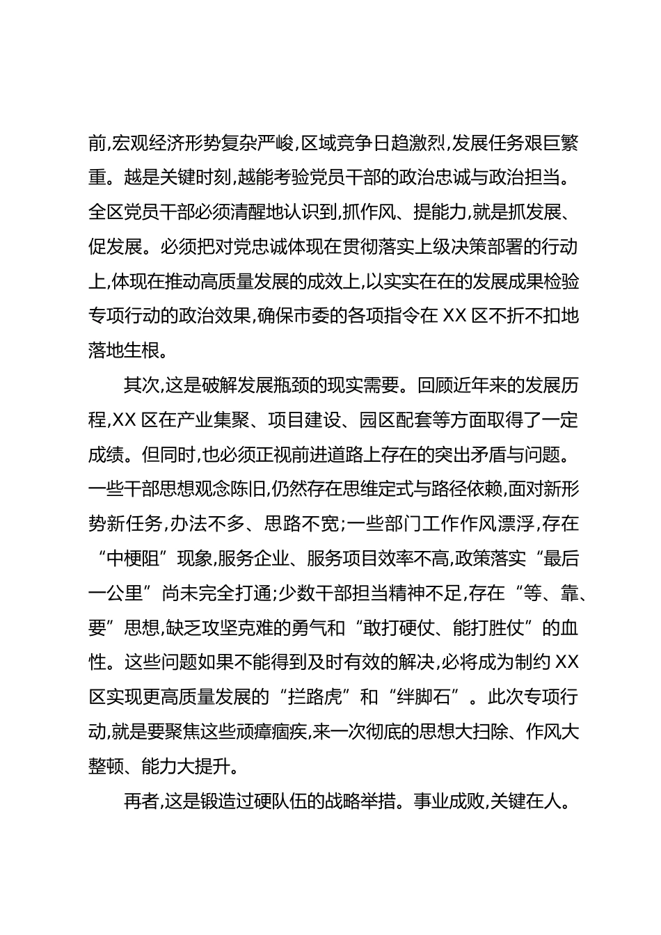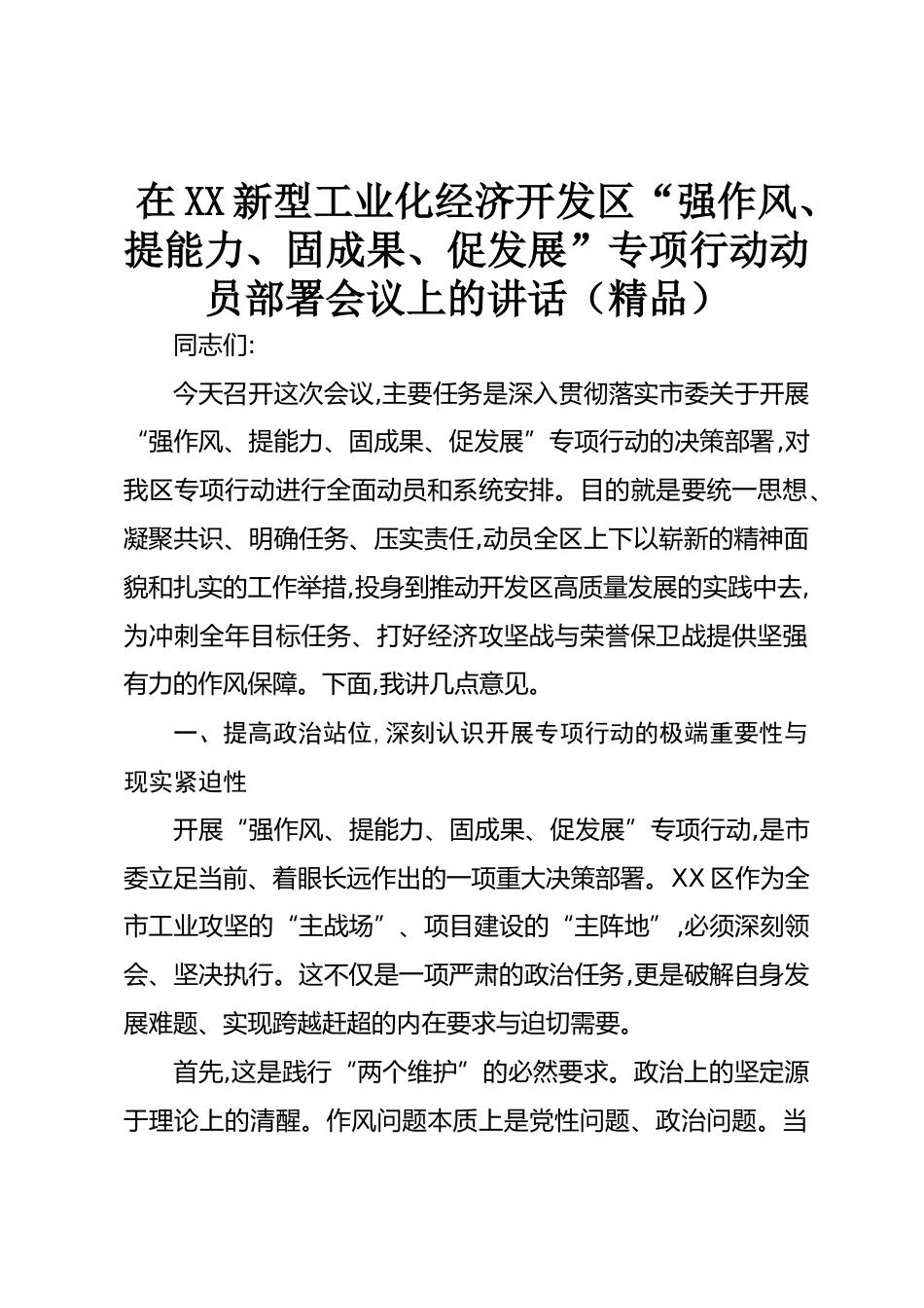在XX新型工業(yè)化經(jīng)濟(jì)開發(fā)區(qū)“強(qiáng)作風(fēng)、提能力、固成果、促發(fā)展”專項(xiàng)行動(dòng)動(dòng)員部署會(huì)議上的講話(精品)同志們:今天召開這次會(huì)議,主要任務(wù)是深入貫徹落實(shí)市委關(guān)于開展“強(qiáng)作風(fēng)、提能力、固成果、促發(fā)展”專項(xiàng)行動(dòng)的決策部署,對(duì)我區(qū)專項(xiàng)行動(dòng)進(jìn)行全面動(dòng)員和系統(tǒng)安排。目的就是要統(tǒng)一思想、凝聚共識(shí)、明確任務(wù)、壓實(shí)責(zé)任,動(dòng)員全區(qū)上下以嶄新的精神面貌和扎實(shí)的工作舉措,投身到推動(dòng)開發(fā)區(qū)高質(zhì)量發(fā)展的實(shí)踐中去,為沖刺全年目標(biāo)任務(wù)、打好經(jīng)濟(jì)攻堅(jiān)戰(zhàn)與榮譽(yù)保衛(wèi)戰(zhàn)提供堅(jiān)強(qiáng)有力的作風(fēng)保障。下面,我講幾點(diǎn)意見。一、提高政治站位,深刻認(rèn)識(shí)開展專項(xiàng)行動(dòng)的極端重要性與現(xiàn)實(shí)緊迫性開展“...