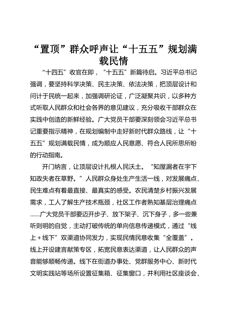 “置頂”群眾呼聲讓“十五五”規(guī)劃滿載民情“十四五”收官在即,“十五五”新篇待啟。習(xí)近平總書(shū)記強(qiáng)調(diào),要堅(jiān)持科學(xué)決策、民主決策、依法決策,把頂層設(shè)計(jì)和問(wèn)計(jì)于民統(tǒng)一起來(lái),加強(qiáng)調(diào)研論證,廣泛凝聚共識(shí),以多種方式聽(tīng)取人民群眾和社會(huì)各界的意見(jiàn)建議,充分吸收干部群眾在實(shí)踐中創(chuàng)造的新鮮經(jīng)驗(yàn)。廣大黨員干部要深刻領(lǐng)會(huì)習(xí)近平總書(shū)記重要指示精神,在規(guī)劃編制中走好新時(shí)代群眾路線,讓“十五五”規(guī)劃滿載民情,成為順應(yīng)人民意愿、符合人民所思所盼的行動(dòng)指南。開(kāi)門(mén)納言,讓頂層設(shè)計(jì)扎根人民沃土?!爸萋┱咴谟钕轮д咴诓菀??!比嗣袢罕娚硖幧a(chǎn)生活一線,對(duì)發(fā)展痛...