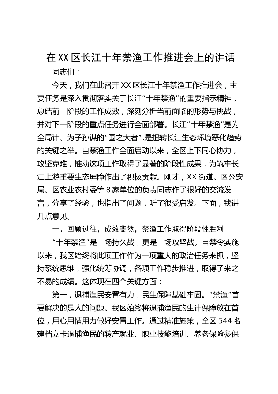 在區(qū)長(zhǎng)江十年禁漁工作推進(jìn)會(huì)上的講話