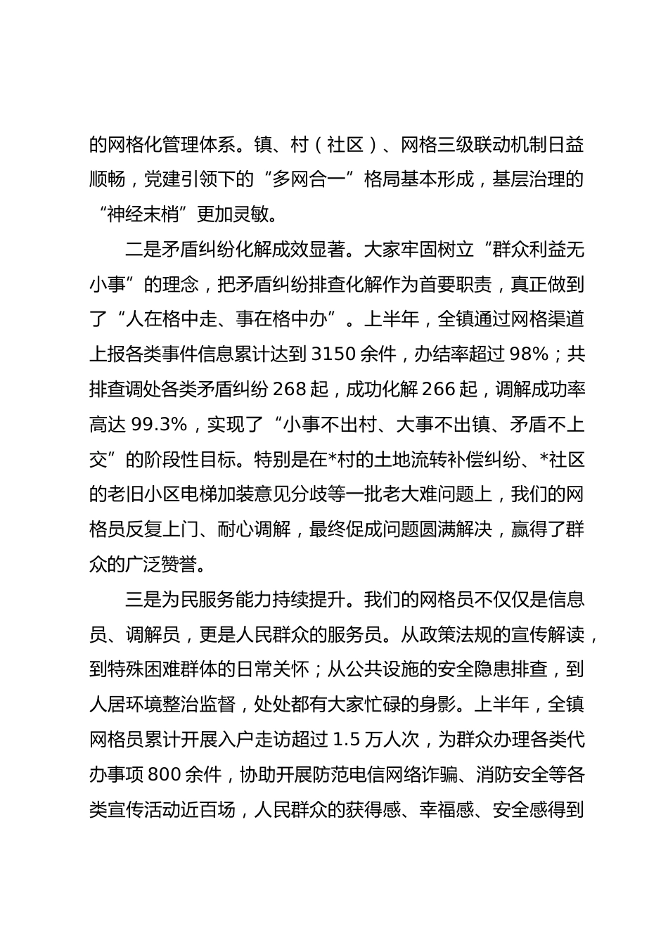 在2025年全縣黨的建設(shè)工作領(lǐng)導(dǎo)小組會議上的講話同志們:今天,我們在這里召開全鎮(zhèn)2025年上半年網(wǎng)格化工作總結(jié)暨網(wǎng)格員培訓(xùn)會議,主要任務(wù)是全面總結(jié)上半年我鎮(zhèn)網(wǎng)格化工作的成績與不足,深入分析當(dāng)前面臨的形勢與挑戰(zhàn),安排部署下半年重點工作,并對全體網(wǎng)格員進(jìn)行一次集中“充電賦能”。這既是一次總結(jié)評議會,也是一次動員部署會,更是一次業(yè)務(wù)提升會。剛才,相關(guān)同志已經(jīng)傳達(dá)了《關(guān)于基層治理網(wǎng)格化工作的實施方案》的核心精神,并通報了上半年的工作情況,我都同意。下面,我講三點意見。一、肯定成績,總結(jié)經(jīng)驗,在服務(wù)大局中彰顯網(wǎng)格擔(dān)當(dāng)今年以來,在鎮(zhèn)黨工委、政府...