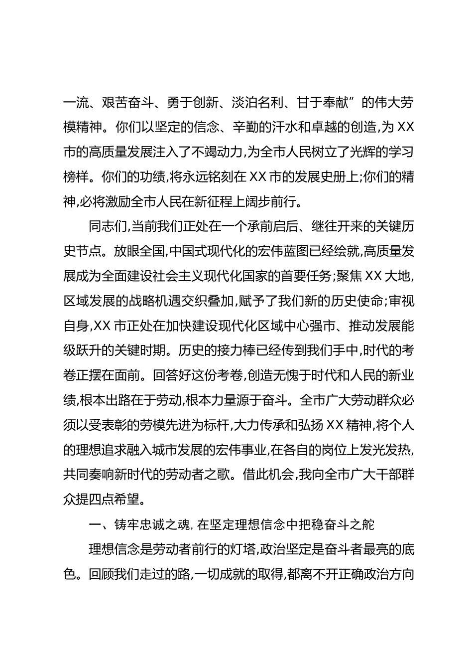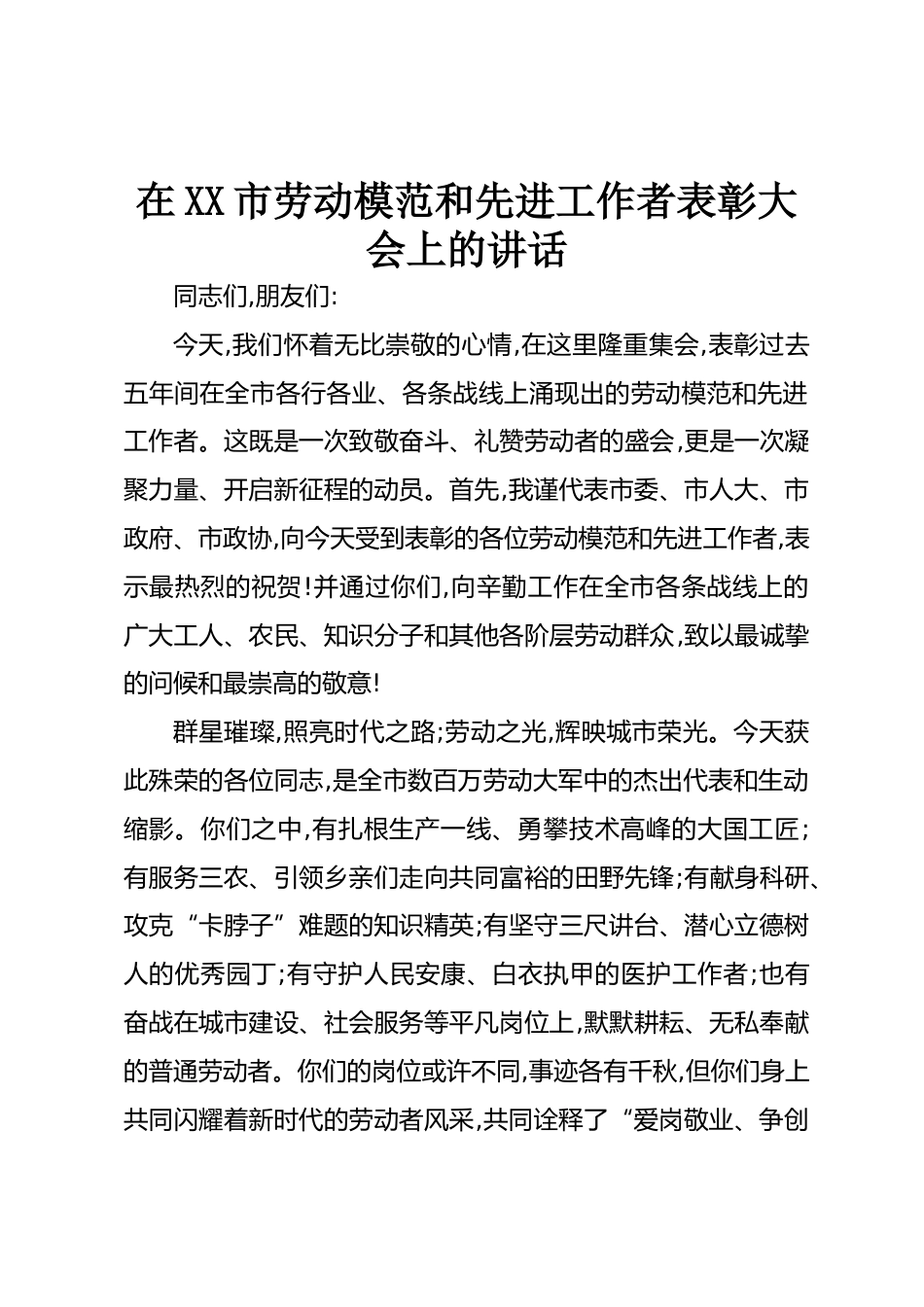 在XX市勞動(dòng)模范和先進(jìn)工作者表彰大會(huì)上的講話同志們,朋友們:今天,我們懷著無比崇敬的心情,在這里隆重集會(huì),表彰過去五年間在全市各行各業(yè)、各條戰(zhàn)線上涌現(xiàn)出的勞動(dòng)模范和先進(jìn)工作者。這既是一次致敬奮斗、禮贊勞動(dòng)者的盛會(huì),更是一次凝聚力量、開啟新征程的動(dòng)員。首先,我謹(jǐn)代表市委、市人大、市政府、市政協(xié),向今天受到表彰的各位勞動(dòng)模范和先進(jìn)工作者,表示最熱烈的祝賀!并通過你們,向辛勤工作在全市各條戰(zhàn)線上的廣大工人、農(nóng)民、知識(shí)分子和其他各階層勞動(dòng)群眾,致以最誠摯的問候和最崇高的敬意!群星璀璨,照亮?xí)r代之路;勞動(dòng)之光,輝映城市榮光。今天獲此殊榮的各位同志,是全...