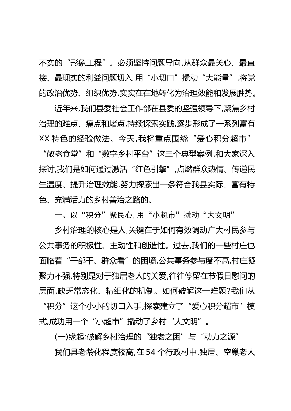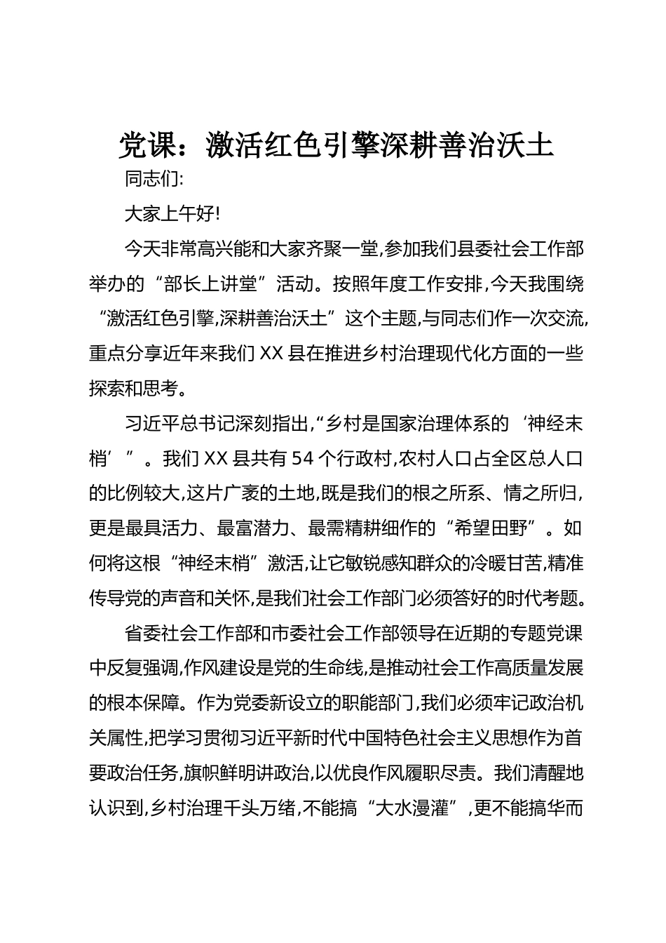 黨課:激活紅色引擎深耕善治沃土同志們:大家上午好!今天非常高興能和大家齊聚一堂,參加我們縣委社會工作部舉辦的“部長上講堂”活動。按照年度工作安排,今天我圍繞“激活紅色引擎,深耕善治沃土”這個主題,與同志們作一次交流,重點分享近年來我們XX縣在推進(jìn)鄉(xiāng)村治理現(xiàn)代化方面的一些探索和思考。習(xí)近平總書記深刻指出,“鄉(xiāng)村是國家治理體系的‘神經(jīng)末梢’”。我們XX縣共有54個行政村,農(nóng)村人口占全區(qū)總?cè)丝诘谋壤^大,這片廣袤的土地,既是我們的根之所系、情之所歸,更是最具活力、最富潛力、最需精耕細(xì)作的“希望田野”。如何將這根“神經(jīng)末梢”激活,讓它敏銳感知群眾的冷...