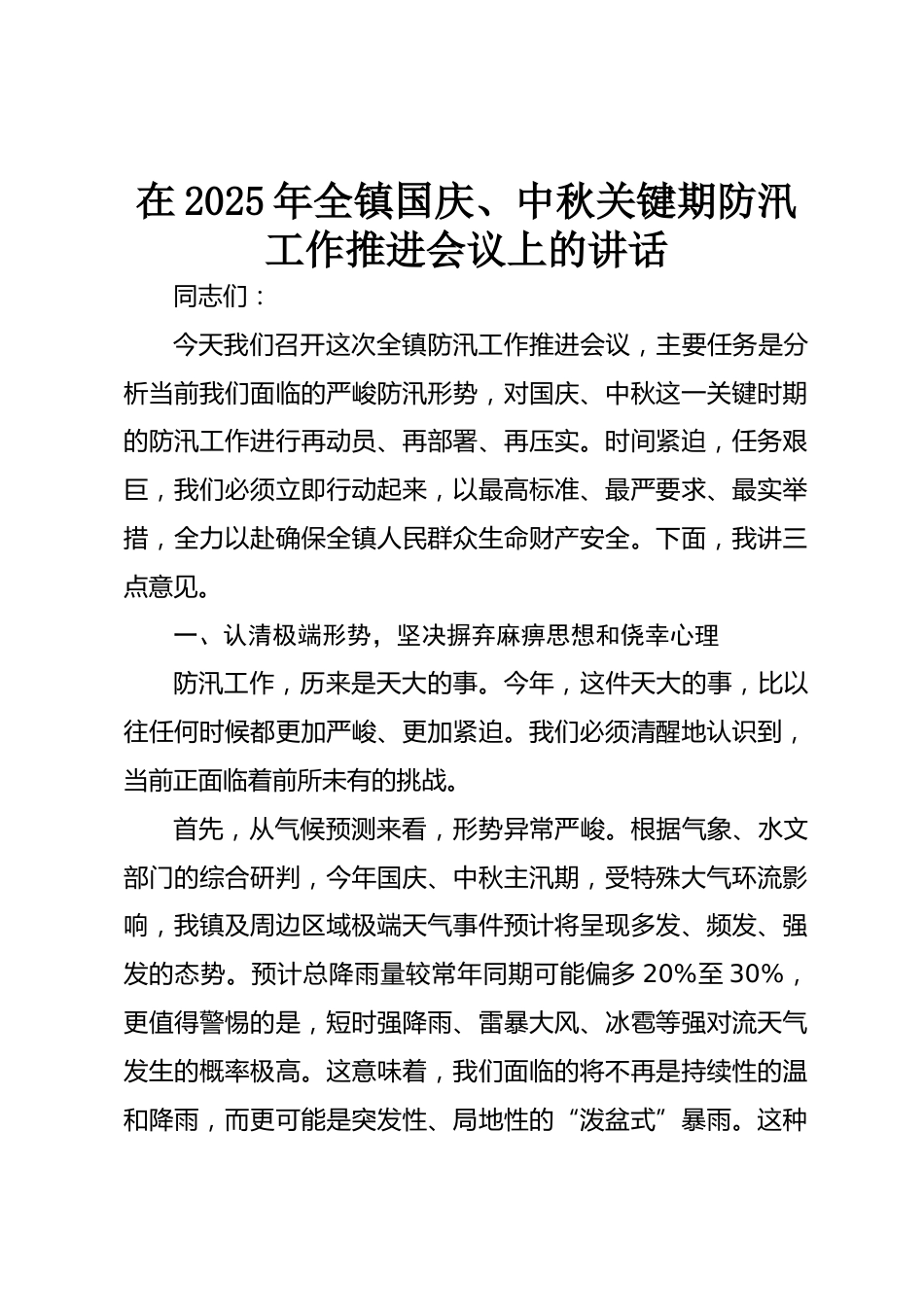 在2025年全鎮(zhèn)國慶、中秋關鍵期防汛工作推進會議上的講話