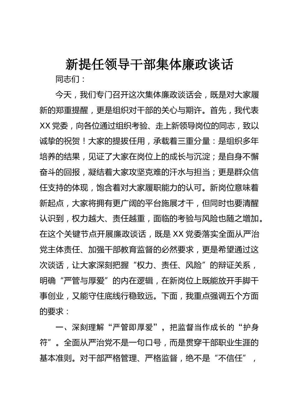 新提任領(lǐng)導(dǎo)干部集體廉政談話同志們:今天,我們專門召開這次集體廉政談話會,既是對大家履新的鄭重提醒,更是組織對干部的關(guān)心與期許。首先,我代表XX黨委,向各位通過組織考驗(yàn)、走上新領(lǐng)導(dǎo)崗位的同志,致以誠摯的祝賀!大家的提拔任用,承載著三重分量:是組織多年培養(yǎng)的結(jié)果,見證了大家在崗位上的成長與沉淀;是自身不懈奮斗的回報,凝結(jié)著大家攻堅(jiān)克難的汗水與擔(dān)當(dāng);更是群眾信任支持的體現(xiàn),飽含著對大家履職能力的認(rèn)可。新崗位意味著新起點(diǎn),大家將擁有更廣闊的平臺施展才干,但同時也要清醒認(rèn)識到,權(quán)力越大、責(zé)任越重,面臨的考驗(yàn)與風(fēng)險也隨之增加。在這個關(guān)鍵節(jié)...