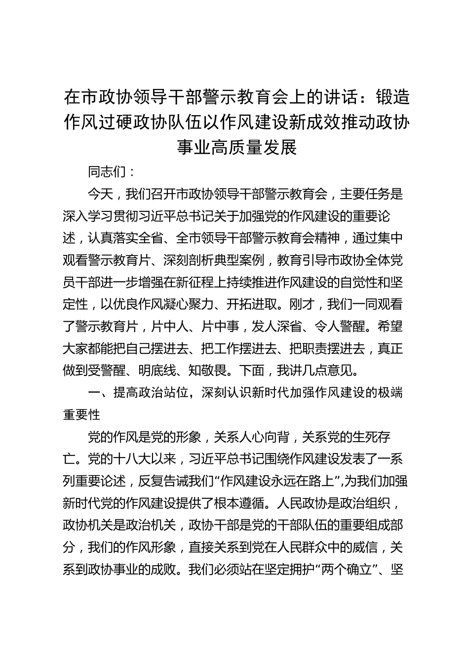 在市政協(xié)領(lǐng)導(dǎo)干部警示教育會(huì)上的講話:鍛造作風(fēng)過硬政協(xié)隊(duì)伍以作風(fēng)建設(shè)新成效推動(dòng)政協(xié)事業(yè)高質(zhì)量發(fā)展同志們:今天,我們召開市政協(xié)領(lǐng)導(dǎo)干部警示教育會(huì),主要任務(wù)是深入學(xué)習(xí)貫徹習(xí)近平總書記關(guān)于加強(qiáng)黨的作風(fēng)建設(shè)的重要論述,認(rèn)真落實(shí)全省、全市領(lǐng)導(dǎo)干部警示教育會(huì)精神,通過集中觀看警示教育片、深刻剖析典型案例,教育引導(dǎo)市政協(xié)全體黨員干部進(jìn)一步增強(qiáng)在新征程上持續(xù)推進(jìn)作風(fēng)建設(shè)的自覺性和堅(jiān)定性,以優(yōu)良作風(fēng)凝心聚力、開拓進(jìn)取。剛才,我們一同觀看了警示教育片,片中人、片中事,發(fā)人深省、令人警醒。希望大家都能把自己擺進(jìn)去、把工作擺進(jìn)去、把職責(zé)擺進(jìn)去,真正做...