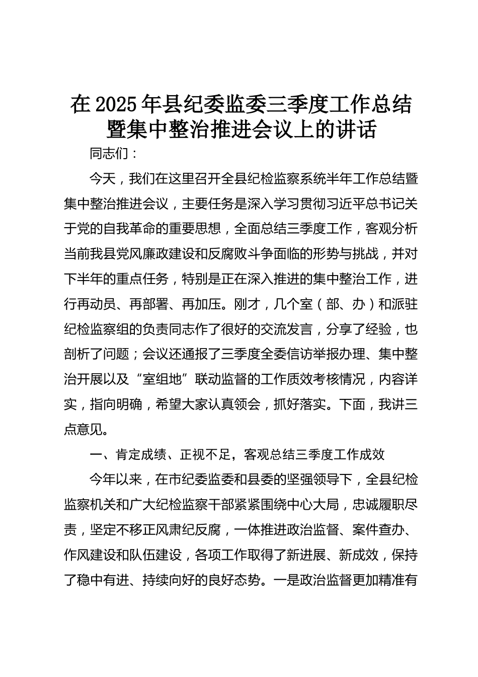在2025年縣紀(jì)委監(jiān)委三季度工作總結(jié)暨集中整治推進(jìn)會(huì)議上的講話