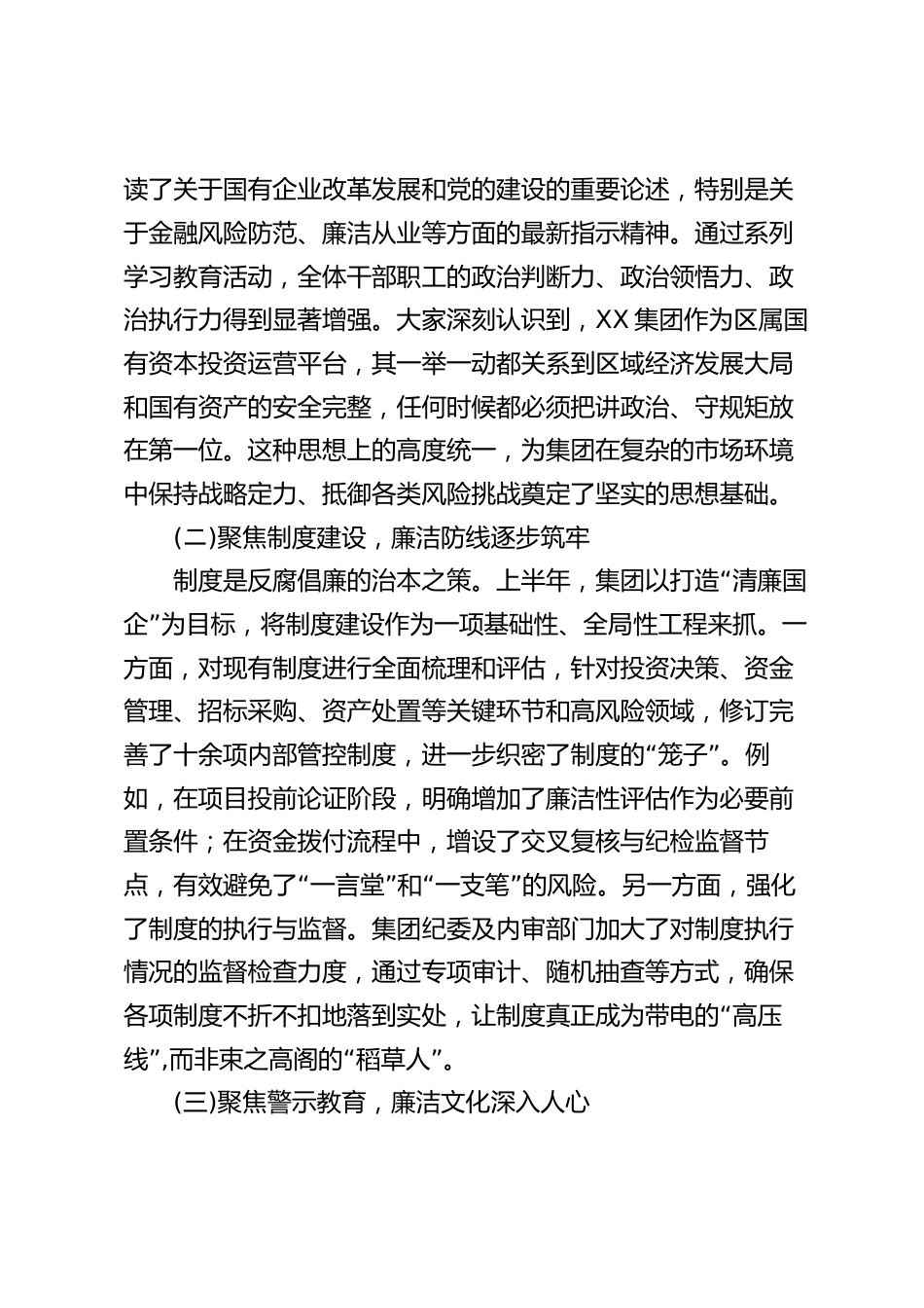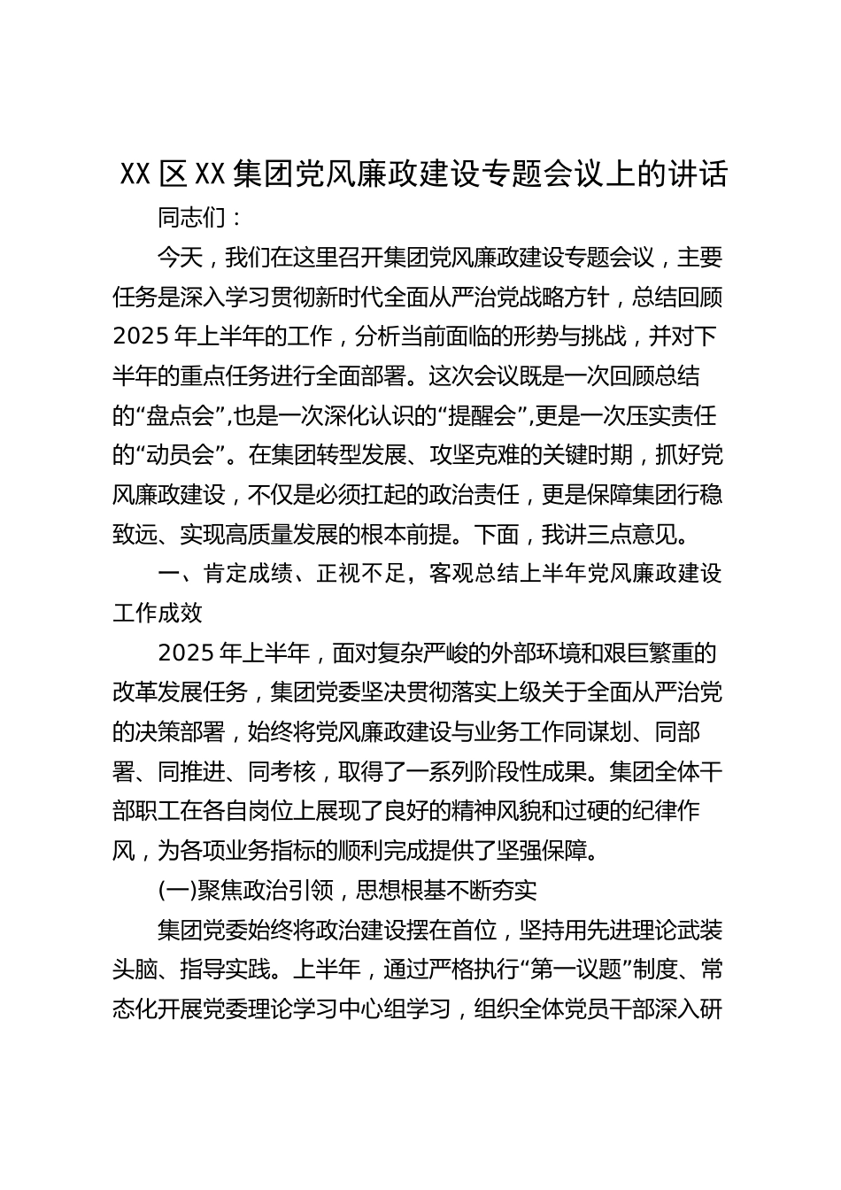 XX區(qū)XX集團黨風廉政建設(shè)專題會議上的講話同志們:今天,我們在這里召開集團黨風廉政建設(shè)專題會議,主要任務是深入學習貫徹新時代全面從嚴治黨戰(zhàn)略方針,總結(jié)回顧2025年上半年的工作,分析當前面臨的形勢與挑戰(zhàn),并對下半年的重點任務進行全面部署。這次會議既是一次回顧總結(jié)“”的盤點會,“”也是一次深化認識的提醒會,更是一次壓實責任“”的動員會。在集團轉(zhuǎn)型發(fā)展、攻堅克難的關(guān)鍵時期,抓好黨風廉政建設(shè),不僅是必須扛起的政治責任,更是保障集團行穩(wěn)致遠、實現(xiàn)高質(zhì)量發(fā)展的根本前提。下面,我講三點意見。一、肯定成績、正視不足,客觀總結(jié)上半年黨風廉政建設(shè)工作成...