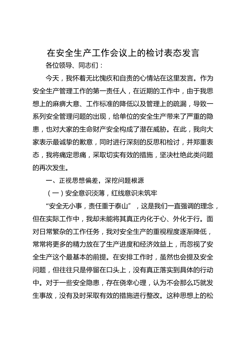 在安全生產(chǎn)工作會議上的檢討表態(tài)發(fā)言各位領導、同志們:今天,我懷著無比愧疚和自責的心情站在這里發(fā)言。作為安全生產(chǎn)管理工作的第一責任人,在近期的工作中,由于我思想上的麻痹大意、工作標準的降低以及管理上的疏漏,導致一系列安全管理問題的出現(xiàn),給單位的安全生產(chǎn)帶來了嚴重的隱患,也對大家的生命財產(chǎn)安全構(gòu)成了潛在威脅。在此,我向大家表示最誠摯的歉意,同時進行深刻的反思和檢討,并鄭重表態(tài),我將痛定思痛,采取切實有效的措施,堅決杜絕此類問題的再次發(fā)生。一、正視思想偏差,深挖問題根源(一)安全意識淡薄,紅線意識未筑牢“安全無小事,責任重于泰山”...