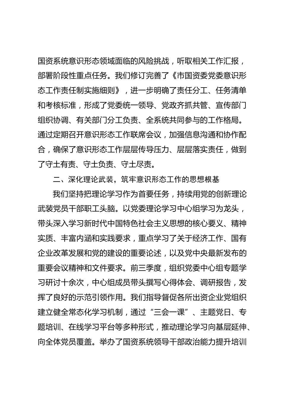 市國(guó)資委委員會(huì)關(guān)于2025年前三季度意識(shí)形態(tài)工作責(zé)任制落實(shí)情況總結(jié)報(bào)告市委:2025年前三季度,市國(guó)資委黨委堅(jiān)持深入學(xué)習(xí)貫徹黨的二十大和二十屆三中、四中全會(huì)精神,嚴(yán)格落實(shí)黨中央、省委和市委關(guān)于意識(shí)形態(tài)工作的決策部署和工作要求,深刻認(rèn)識(shí)意識(shí)形態(tài)工作的極端重要性,緊緊圍繞國(guó)資國(guó)企改革發(fā)展和黨的建設(shè)中心任務(wù),牢牢掌握意識(shí)形態(tài)工作領(lǐng)導(dǎo)權(quán)、管理權(quán)、話語(yǔ)權(quán),以高度的政治自覺和扎實(shí)的工作舉措,推動(dòng)所出資企業(yè)意識(shí)形態(tài)工作責(zé)任制落到實(shí)處、見到實(shí)效,為全市國(guó)有經(jīng)濟(jì)高質(zhì)量發(fā)展提供了堅(jiān)強(qiáng)的思想保證、強(qiáng)大的精神力量和有利的輿論環(huán)境。現(xiàn)將具體情況總結(jié)報(bào)告如下。...