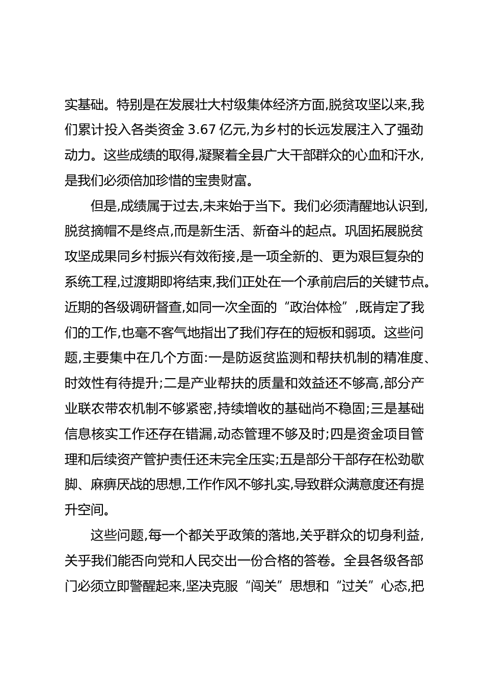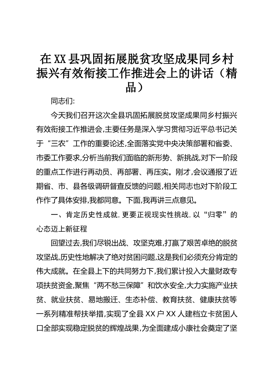 在XX縣鞏固拓展脫貧攻堅(jiān)成果同鄉(xiāng)村振興有效銜接工作推進(jìn)會(huì)上的講話(精品)同志們:今天我們召開(kāi)這次全縣鞏固拓展脫貧攻堅(jiān)成果同鄉(xiāng)村振興有效銜接工作推進(jìn)會(huì),主要任務(wù)是深入學(xué)習(xí)貫徹習(xí)近平總書(shū)記關(guān)于“三農(nóng)”工作的重要論述,全面落實(shí)黨中央決策部署和省委、市委工作要求,分析當(dāng)前我們面臨的新形勢(shì)、新挑戰(zhàn),對(duì)下一階段的重點(diǎn)工作進(jìn)行再動(dòng)員、再部署、再壓實(shí)。剛才,會(huì)議通報(bào)了近期省、市、縣各級(jí)調(diào)研督查反饋的問(wèn)題,相關(guān)同志也對(duì)下階段工作作了具體安排,我都同意。下面,我再講三點(diǎn)意見(jiàn)。一、肯定歷史性成就,更要正視現(xiàn)實(shí)性挑戰(zhàn),以“歸零”的心態(tài)邁上新征程回望過(guò)去,我們盡銳...
