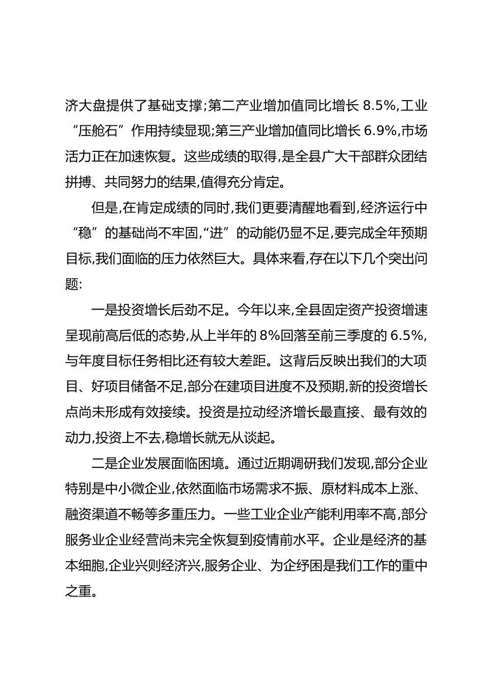 在XX縣經(jīng)濟(jì)運(yùn)行暨抓項(xiàng)目促投資工作推進(jìn)會(huì)上的講話(精品)同志們:今天,受XX書記委托,我們召開(kāi)這次全縣經(jīng)濟(jì)運(yùn)行暨抓項(xiàng)目促投資工作推進(jìn)會(huì)。會(huì)議的主要任務(wù)是,深入學(xué)習(xí)貫徹近期省委、市委關(guān)于經(jīng)濟(jì)工作的最新會(huì)議精神和決策部署,全面分析我縣當(dāng)前經(jīng)濟(jì)運(yùn)行態(tài)勢(shì),研判存在的問(wèn)題與挑戰(zhàn),并對(duì)今年最后一個(gè)季度的經(jīng)濟(jì)工作,特別是項(xiàng)目建設(shè)和投資促進(jìn)工作進(jìn)行再動(dòng)員、再部署、再加壓。剛才,縣級(jí)有關(guān)部門、重點(diǎn)項(xiàng)目策劃生成攻堅(jiān)專班和部分鎮(zhèn)的負(fù)責(zé)同志分別作了匯報(bào),講得都很好,既總結(jié)了成績(jī),也分析了問(wèn)題,提出的措施也很有針對(duì)性。下面,我講三點(diǎn)意見(jiàn)。一、認(rèn)清形勢(shì)、正視差距,切實(shí)增...