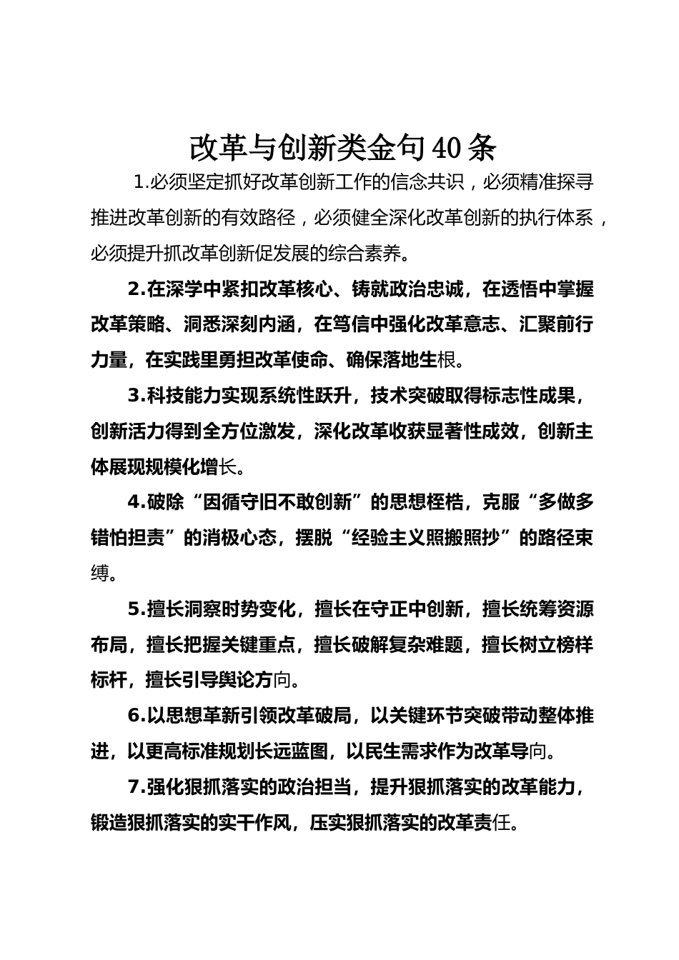 改革與創(chuàng)新類金句40條1.必須堅(jiān)定抓好改革創(chuàng)新工作的信念共識(shí),必須精準(zhǔn)探尋推進(jìn)改革創(chuàng)新的有效路徑,必須健全深化改革創(chuàng)新的執(zhí)行體系,必須提升抓改革創(chuàng)新促發(fā)展的綜合素養(yǎng)。2.在深學(xué)中緊扣改革核心、鑄就政治忠誠(chéng),在透悟中掌握改革策略、洞悉深刻內(nèi)涵,在篤信中強(qiáng)化改革意志、匯聚前行力量,在實(shí)踐里勇?lián)母锸姑⒋_保落地生根。3.科技能力實(shí)現(xiàn)系統(tǒng)性躍升,技術(shù)突破取得標(biāo)志性成果,創(chuàng)新活力得到全方位激發(fā),深化改革收獲顯著性成效,創(chuàng)新主體展現(xiàn)規(guī)模化增長(zhǎng)。4.破除“因循守舊不敢創(chuàng)新”的思想桎梏,克服“多做多錯(cuò)怕?lián)?zé)”的消極心態(tài),擺脫“經(jīng)驗(yàn)主義照搬照抄”的路...
