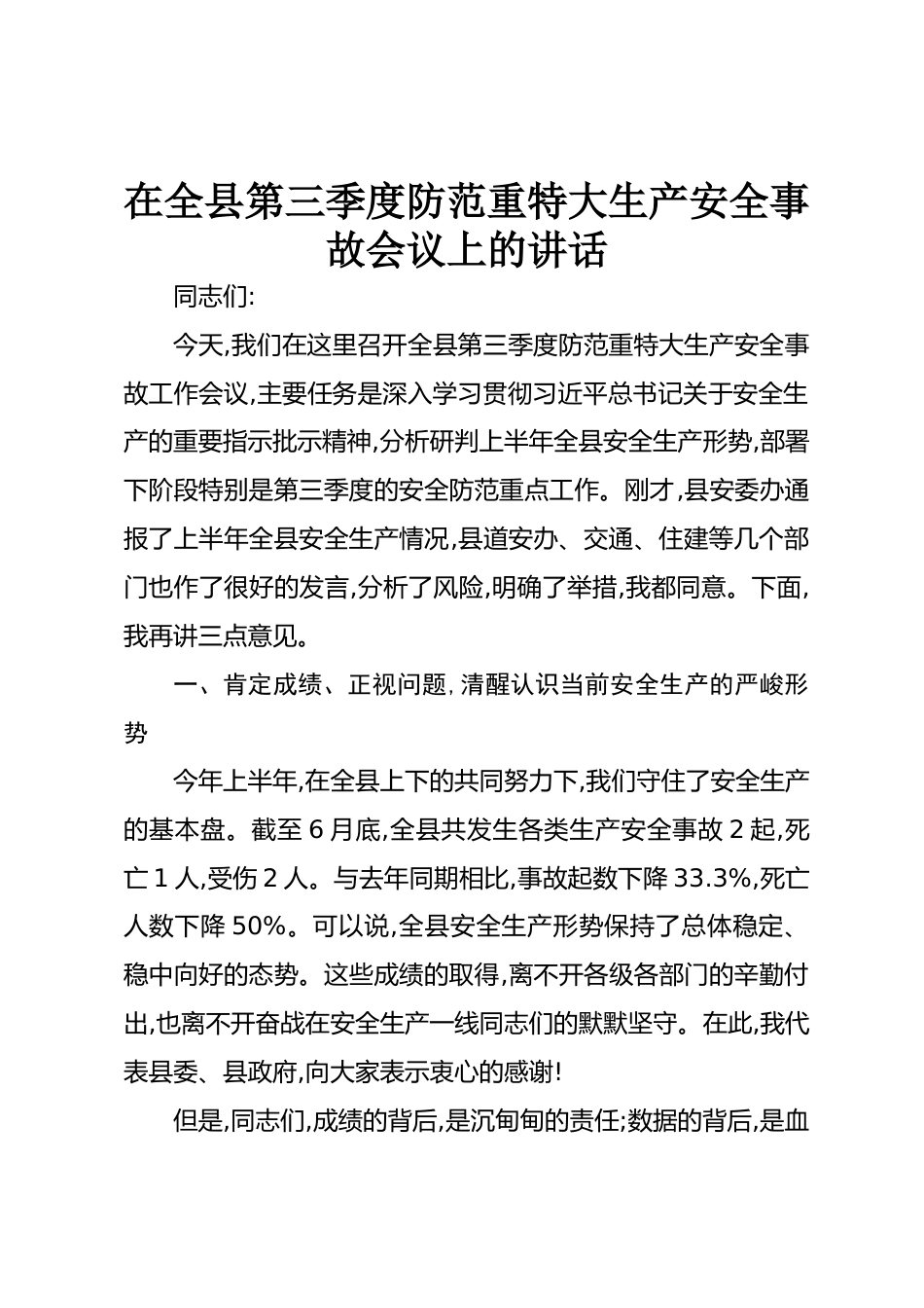 在全縣第三季度防范重特大生產(chǎn)安全事故會議上的講話