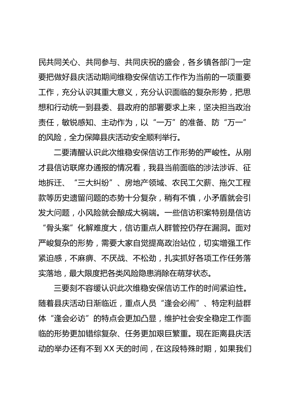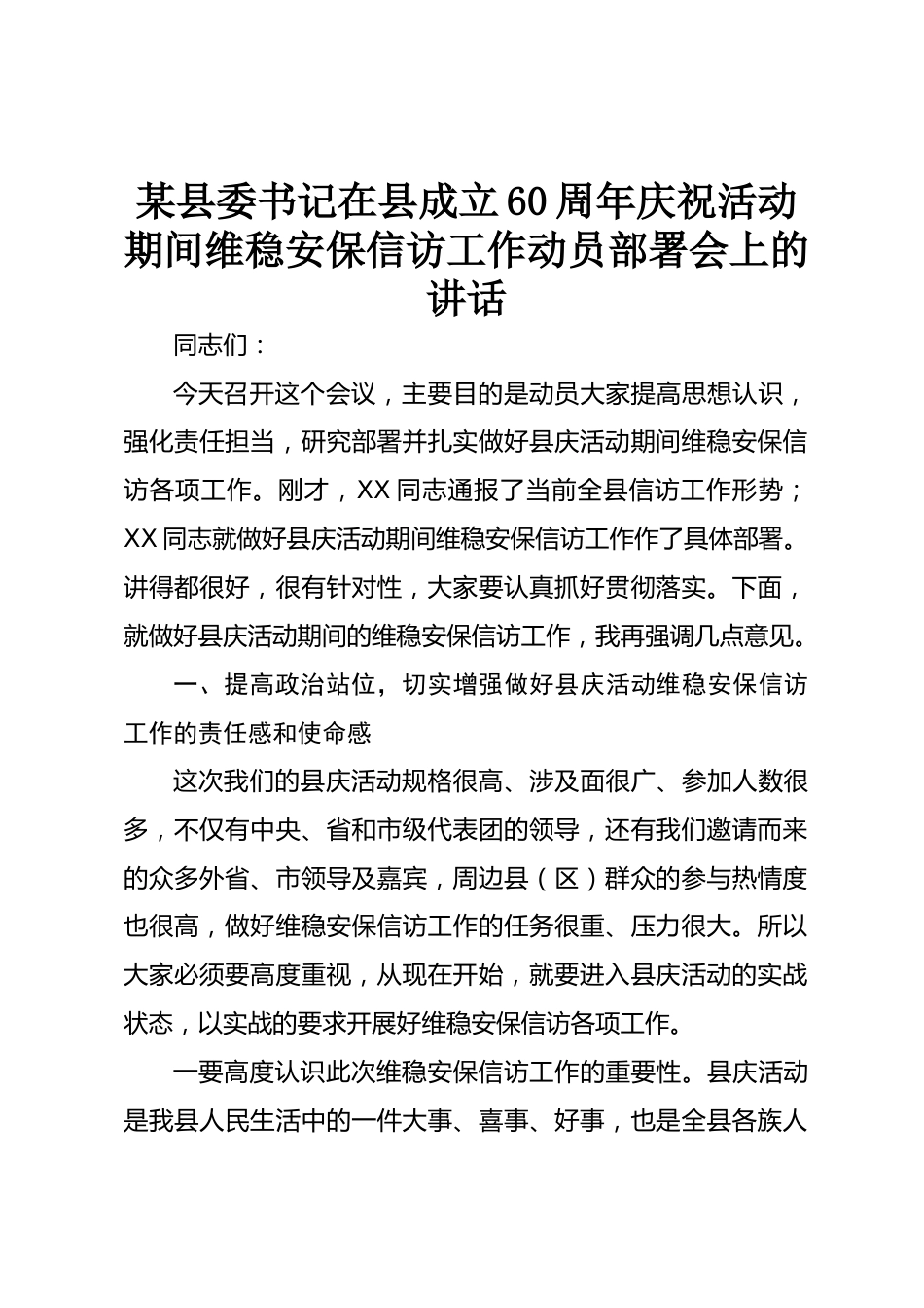 某縣委書記在縣成立60周年慶?;顒?dòng)期間維穩(wěn)安保信訪工作動(dòng)員部署會(huì)上的講話同志們:今天召開這個(gè)會(huì)議,主要目的是動(dòng)員大家提高思想認(rèn)識(shí),強(qiáng)化責(zé)任擔(dān)當(dāng),研究部署并扎實(shí)做好縣慶活動(dòng)期間維穩(wěn)安保信訪各項(xiàng)工作。剛才,XX同志通報(bào)了當(dāng)前全縣信訪工作形勢;XX同志就做好縣慶活動(dòng)期間維穩(wěn)安保信訪工作作了具體部署。講得都很好,很有針對(duì)性,大家要認(rèn)真抓好貫徹落實(shí)。下面,就做好縣慶活動(dòng)期間的維穩(wěn)安保信訪工作,我再強(qiáng)調(diào)幾點(diǎn)意見。一、提高政治站位,切實(shí)增強(qiáng)做好縣慶活動(dòng)維穩(wěn)安保信訪工作的責(zé)任感和使命感這次我們的縣慶活動(dòng)規(guī)格很高、涉及面很廣、參加人數(shù)很多,不僅有中...