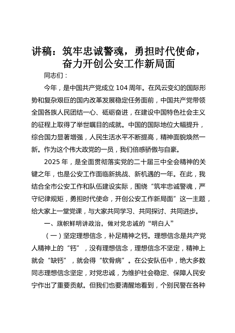 講稿:筑牢忠誠(chéng)警魂,勇?lián)鷷r(shí)代使命,奮力開創(chuàng)公安工作新局面同志們:今年,是中國(guó)共產(chǎn)黨成立104周年。在風(fēng)云變幻的國(guó)際形勢(shì)和復(fù)雜艱巨的國(guó)內(nèi)改革發(fā)展穩(wěn)定任務(wù)面前,中國(guó)共產(chǎn)黨帶領(lǐng)全國(guó)各族人民團(tuán)結(jié)一心、砥礪奮進(jìn),在建設(shè)中國(guó)特色社會(huì)主義的征程上取得了舉世矚目的成就。中國(guó)的國(guó)際地位大幅提升,綜合國(guó)力顯著增強(qiáng),人民生活水平不斷提高,精神面貌煥然一新。作為這個(gè)偉大政黨的一員,我們倍感驕傲與自豪。2025年,是全面貫徹落實(shí)黨的二十屆三中全會(huì)精神的關(guān)鍵之年,也是公安工作面臨新挑戰(zhàn)、新機(jī)遇的一年。在此,我結(jié)合全市公安工作和隊(duì)伍建設(shè)實(shí)際,圍繞“筑牢忠誠(chéng)警魂...