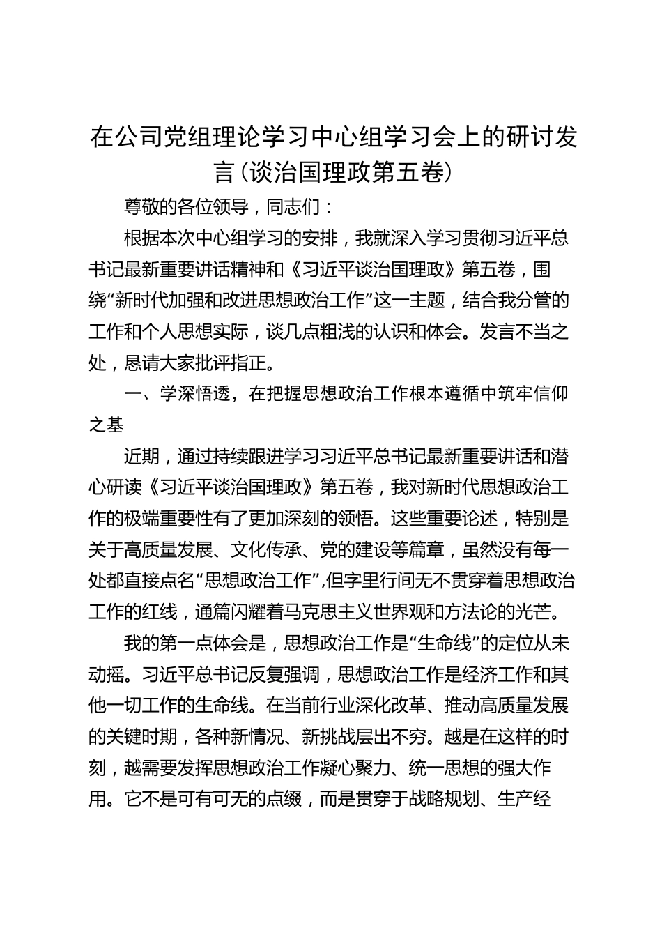 在公司黨組理論學(xué)習(xí)中心組學(xué)習(xí)會(huì)上的研討發(fā)言(談治國(guó)理政第五卷)尊敬的各位領(lǐng)導(dǎo),同志們:根據(jù)本次中心組學(xué)習(xí)的安排,我就深入學(xué)習(xí)貫徹習(xí)近平總書(shū)記最新重要講話精神和《習(xí)近平談治國(guó)理政》第五卷,圍“”繞新時(shí)代加強(qiáng)和改進(jìn)思想政治工作這一主題,結(jié)合我分管的工作和個(gè)人思想實(shí)際,談幾點(diǎn)粗淺的認(rèn)識(shí)和體會(huì)。發(fā)言不當(dāng)之處,懇請(qǐng)大家批評(píng)指正。一、學(xué)深悟透,在把握思想政治工作根本遵循中筑牢信仰之基近期,通過(guò)持續(xù)跟進(jìn)學(xué)習(xí)習(xí)近平總書(shū)記最新重要講話和潛心研讀《習(xí)近平談治國(guó)理政》第五卷,我對(duì)新時(shí)代思想政治工作的極端重要性有了更加深刻的領(lǐng)悟。這些重要論述,特別是...