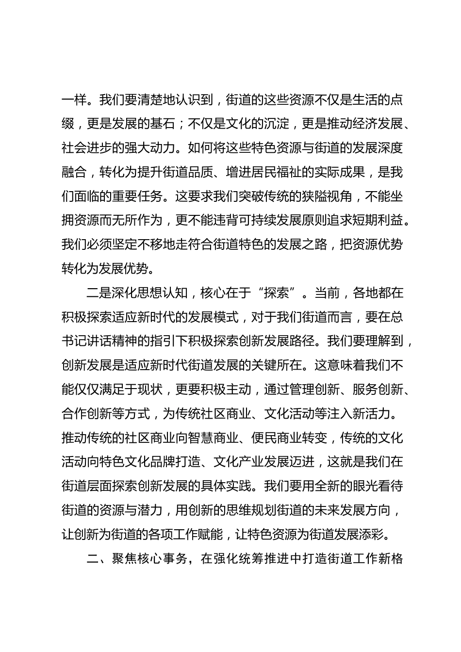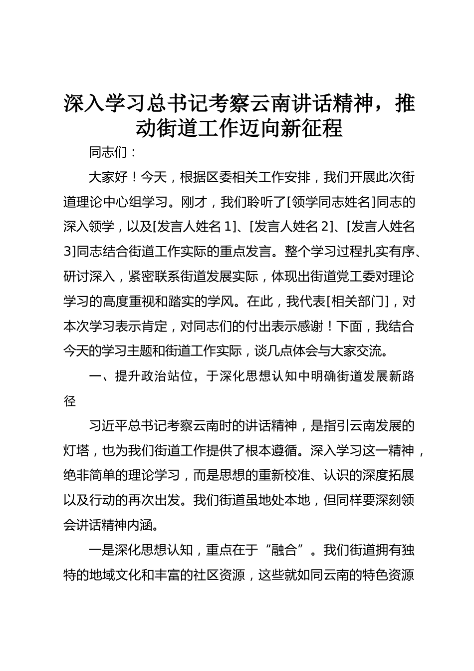 深入學(xué)習(xí)總書記考察云南講話精神,推動街道工作邁向新征程同志們:大家好!今天,根據(jù)區(qū)委相關(guān)工作安排,我們開展此次街道理論中心組學(xué)習(xí)。剛才,我們聆聽了[領(lǐng)學(xué)同志姓名]同志的深入領(lǐng)學(xué),以及[發(fā)言人姓名1]、[發(fā)言人姓名2]、[發(fā)言人姓名3]同志結(jié)合街道工作實際的重點發(fā)言。整個學(xué)習(xí)過程扎實有序、研討深入,緊密聯(lián)系街道發(fā)展實際,體現(xiàn)出街道黨工委對理論學(xué)習(xí)的高度重視和踏實的學(xué)風(fēng)。在此,我代表[相關(guān)部門],對本次學(xué)習(xí)表示肯定,對同志們的付出表示感謝!下面,我結(jié)合今天的學(xué)習(xí)主題和街道工作實際,談幾點體會與大家交流。一、提升政治站位,于深化思想認(rèn)知中明確...