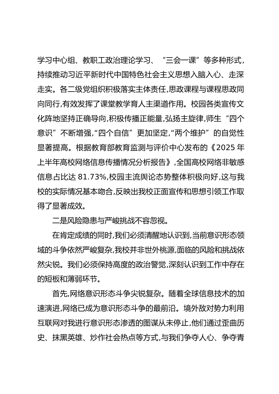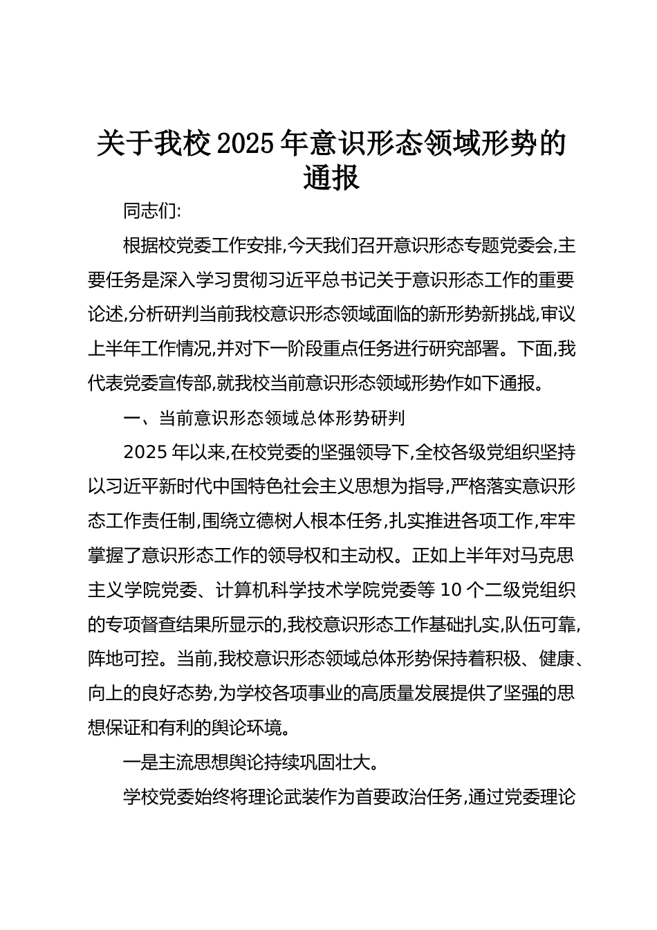 關(guān)于我校2025年意識形態(tài)領(lǐng)域形勢的通報同志們:根據(jù)校黨委工作安排,今天我們召開意識形態(tài)專題黨委會,主要任務(wù)是深入學(xué)習(xí)貫徹習(xí)近平總書記關(guān)于意識形態(tài)工作的重要論述,分析研判當(dāng)前我校意識形態(tài)領(lǐng)域面臨的新形勢新挑戰(zhàn),審議上半年工作情況,并對下一階段重點任務(wù)進行研究部署。下面,我代表黨委宣傳部,就我校當(dāng)前意識形態(tài)領(lǐng)域形勢作如下通報。一、當(dāng)前意識形態(tài)領(lǐng)域總體形勢研判2025年以來,在校黨委的堅強領(lǐng)導(dǎo)下,全校各級黨組織堅持以習(xí)近平新時代中國特色社會主義思想為指導(dǎo),嚴格落實意識形態(tài)工作責(zé)任制,圍繞立德樹人根本任務(wù),扎實推進各項工作,牢牢掌握了意識形態(tài)工作的領(lǐng)導(dǎo)...