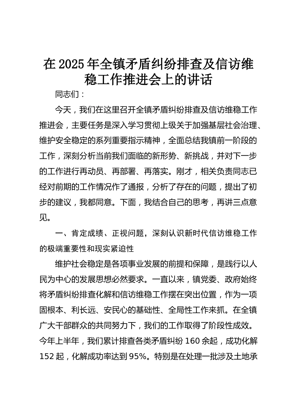 在2025年全鎮(zhèn)矛盾糾紛排查及信訪維穩(wěn)工作推進(jìn)會上的講話
