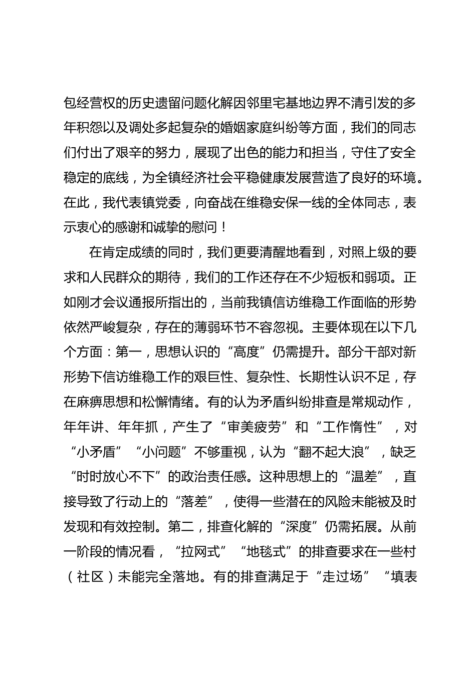 在2025年全鎮(zhèn)矛盾糾紛排查及信訪維穩(wěn)工作推進(jìn)會上的講話同志們:今天,我們在這里召開全鎮(zhèn)矛盾糾紛排查及信訪維穩(wěn)工作推進(jìn)會,主要任務(wù)是深入學(xué)習(xí)貫徹上級關(guān)于加強(qiáng)基層社會治理、維護(hù)安全穩(wěn)定的系列重要指示精神,全面總結(jié)我鎮(zhèn)前一階段的工作,深刻分析當(dāng)前我們面臨的新形勢、新挑戰(zhàn),并對下一步的工作進(jìn)行再動員、再部署、再落實(shí)。剛才,相關(guān)負(fù)責(zé)同志已經(jīng)對前期的工作情況作了通報(bào),分析了存在的問題,提出了初步的建議,我都同意。下面,我結(jié)合自己的思考,再講三點(diǎn)意見。一、肯定成績、正視問題,深刻認(rèn)識新時(shí)代信訪維穩(wěn)工作的極端重要性和現(xiàn)實(shí)緊迫性維護(hù)社會穩(wěn)定是各...