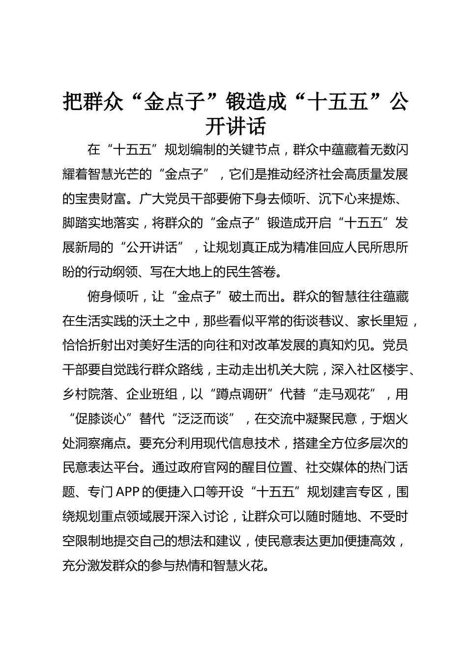 把群眾“金點子”鍛造成“十五五”公開講話在“十五五”規(guī)劃編制的關鍵節(jié)點,群眾中蘊藏著無數(shù)閃耀著智慧光芒的“金點子”,它們是推動經濟社會高質量發(fā)展的寶貴財富。廣大黨員干部要俯下身去傾聽、沉下心來提煉、腳踏實地落實,將群眾的“金點子”鍛造成開啟“十五五”發(fā)展新局的“公開講話”,讓規(guī)劃真正成為精準回應人民所思所盼的行動綱領、寫在大地上的民生答卷。俯身傾聽,讓“金點子”破土而出。群眾的智慧往往蘊藏在生活實踐的沃土之中,那些看似平常的街談巷議、家長里短,恰恰折射出對美好生活的向往和對改革發(fā)展的真知灼見。黨員干部要自覺踐行群眾路線,主動...